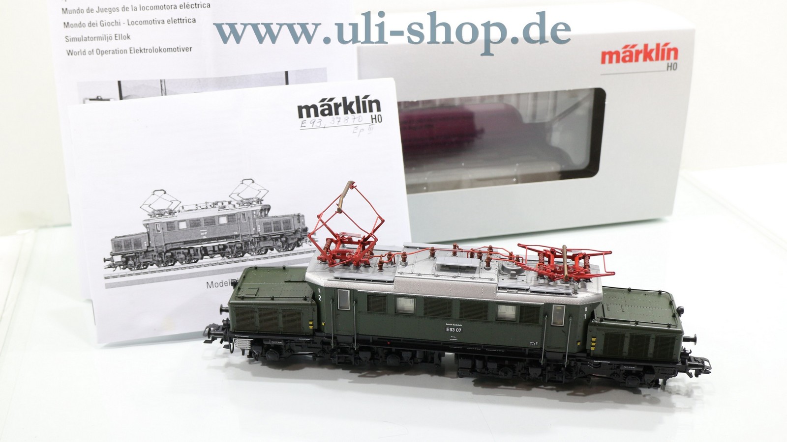 Märklin H0 E-Lok mit der Artikelnummer 37870 E 93 der DB. Der Artikel ist für den Betrieb mit Wechselstrom vorgesehen. Die Lok ist mit einem digitalen mfx-Decoder mit Soundfunktionen ausgestattet. Die Originalverpackung ist vorhanden.