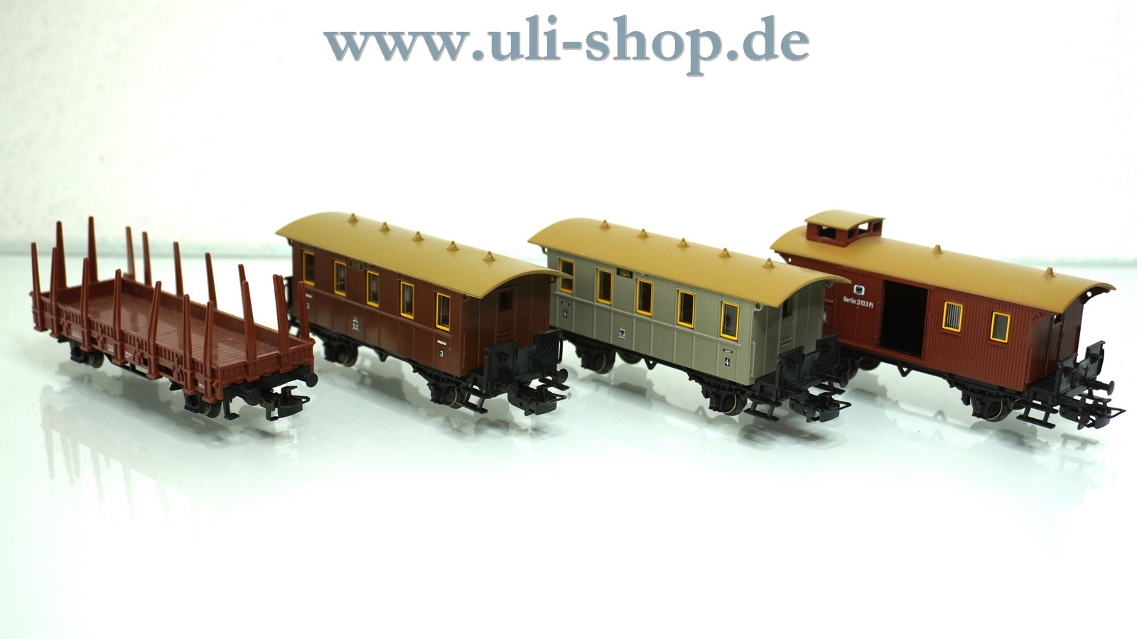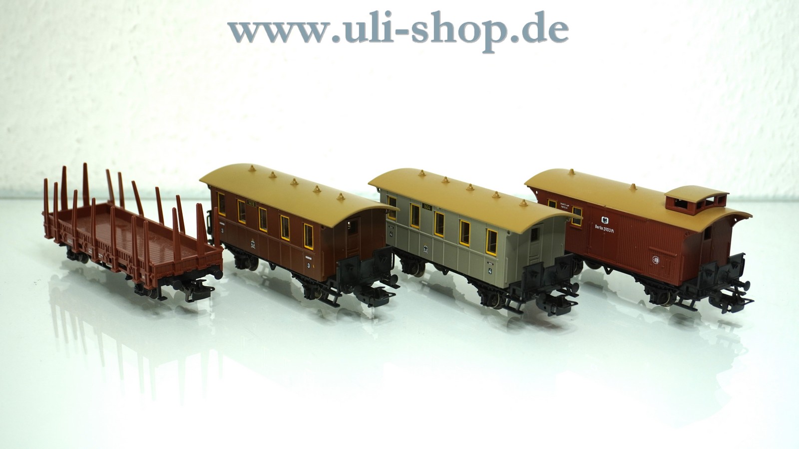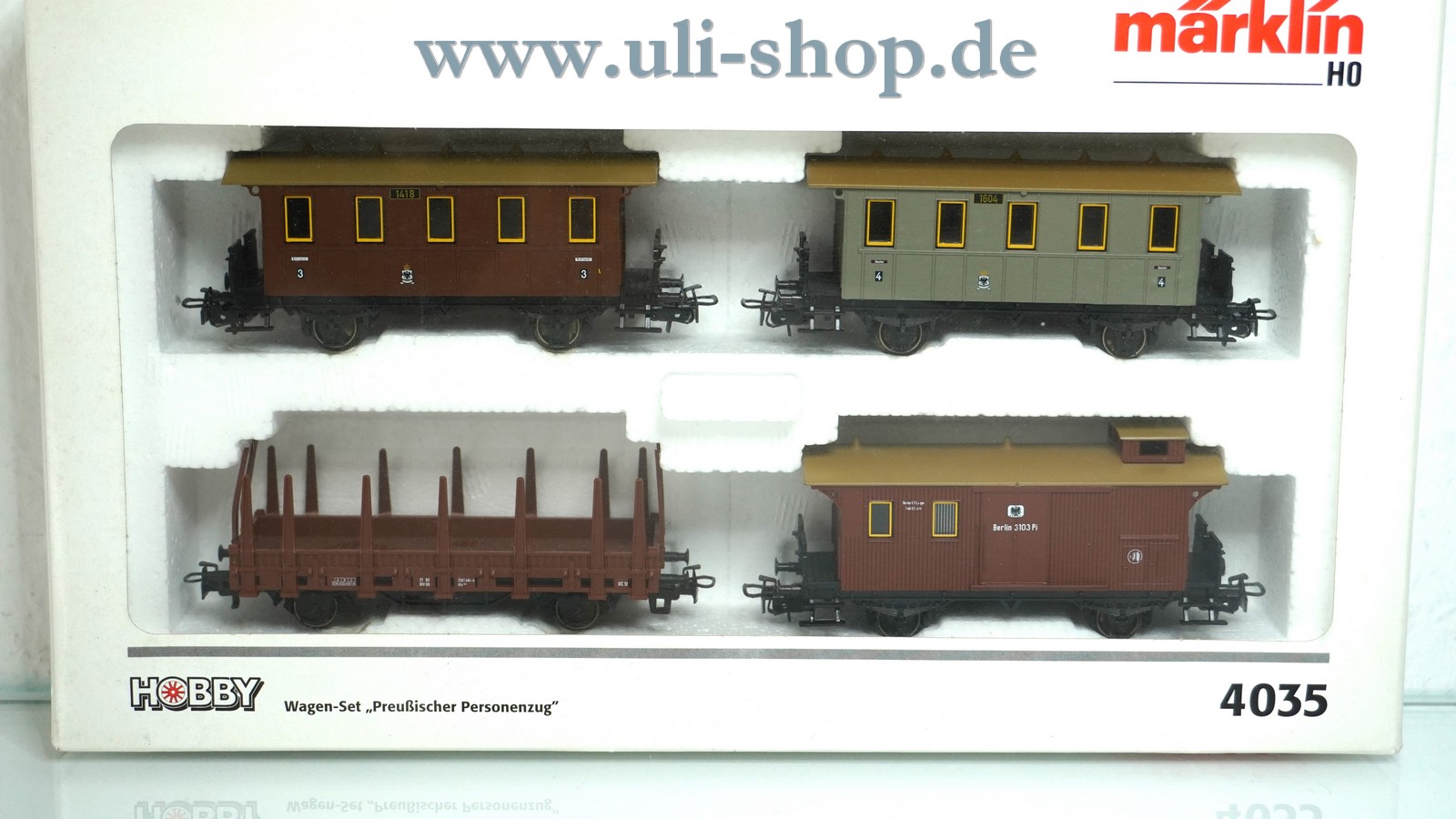 Märklin H0 Wagenpackung mit der Artikelnummer 4035 Preußischer Personenzug. Der Artikel ist für den Betrieb mit Wechselstrom vorgesehen. Die Originalverpackung ist vorhanden. Die Wagenpackung beinhaltet mit dem Rungenwagen einen falschen Wagen.