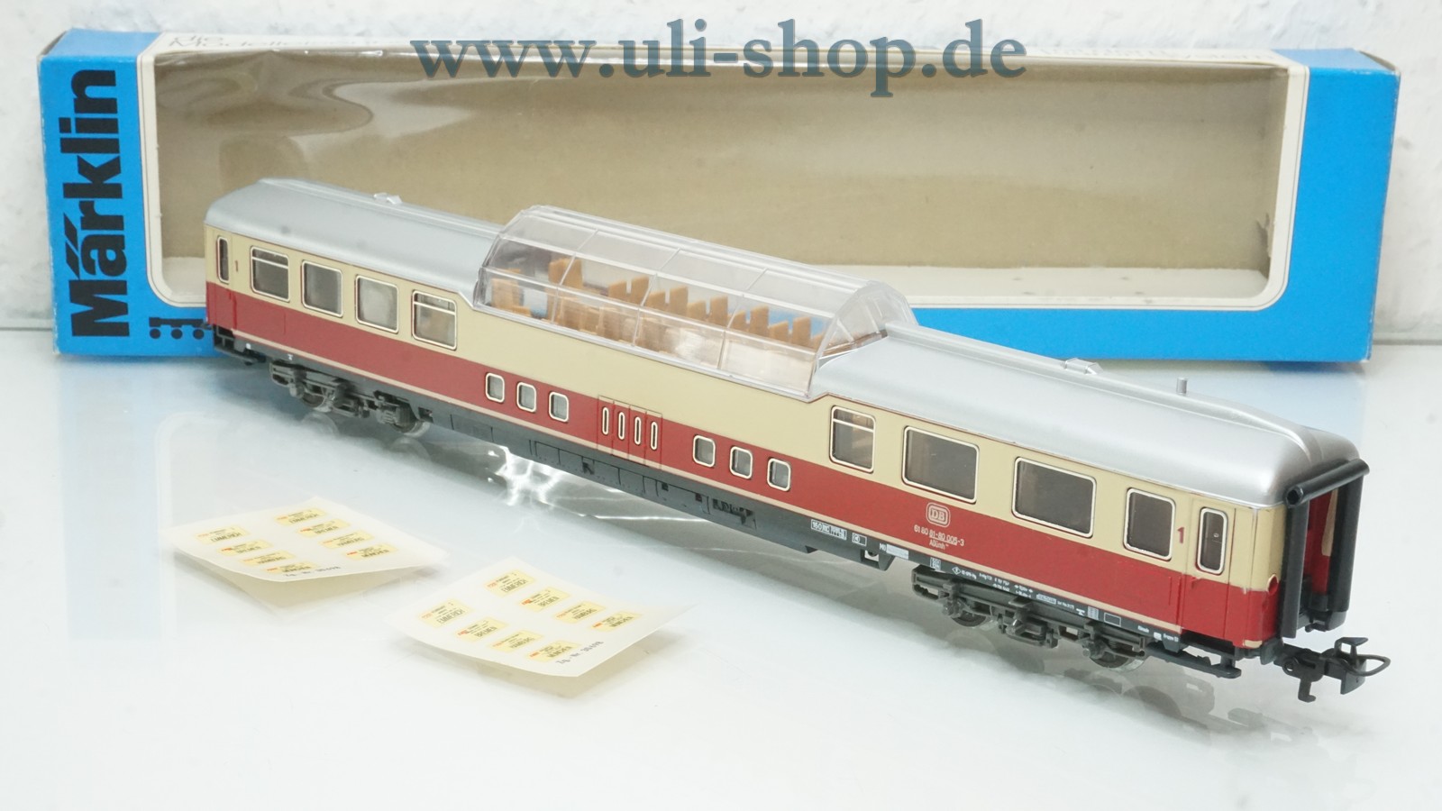 Märklin H0 Personenwagen mit der Artikelnummer 4099 TEE Panoramawagen 1. Klasse der DB. Der Artikel ist für den Betrieb mit Wechselstrom vorgesehen. Die Originalverpackung ist vorhanden.