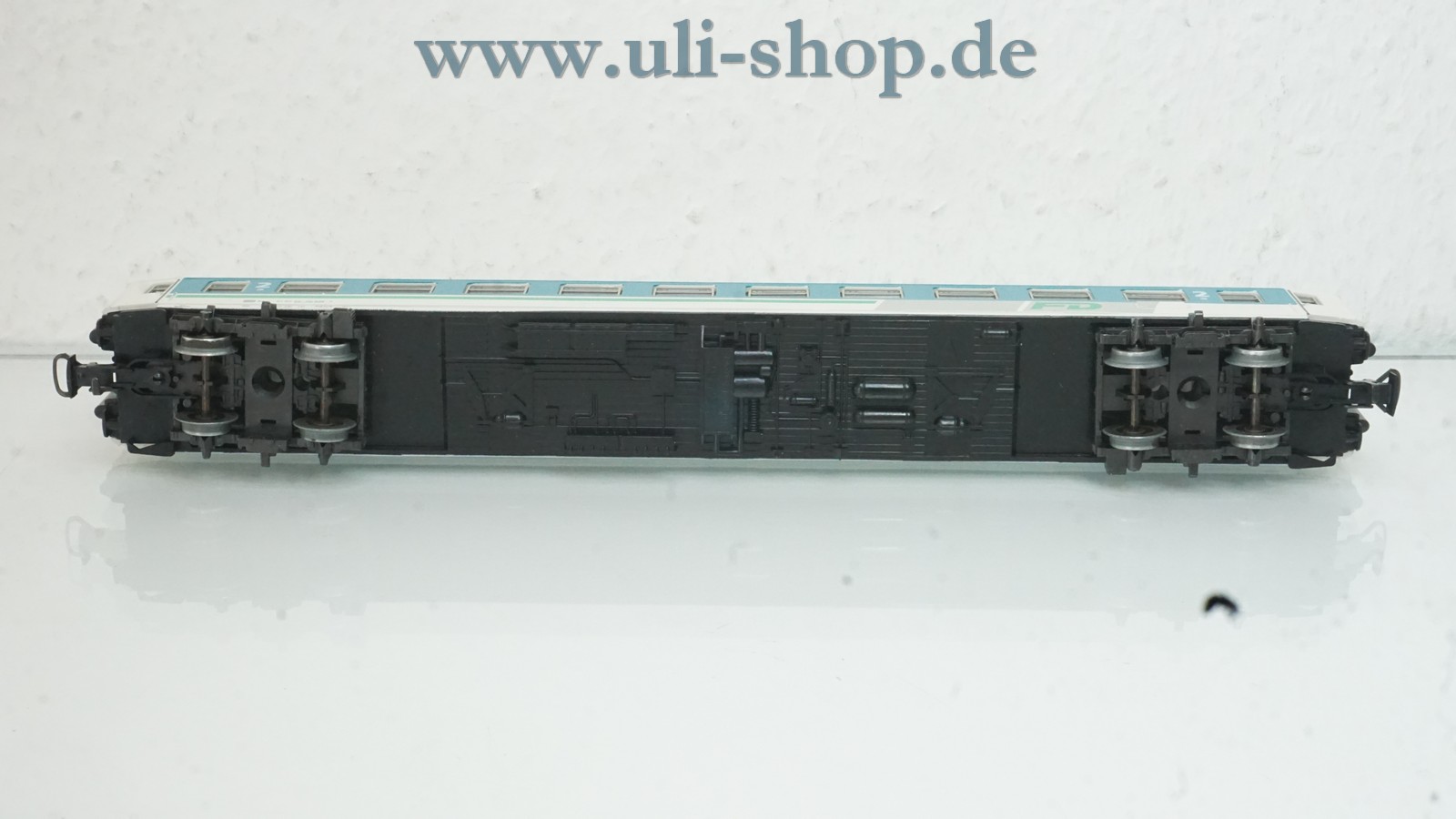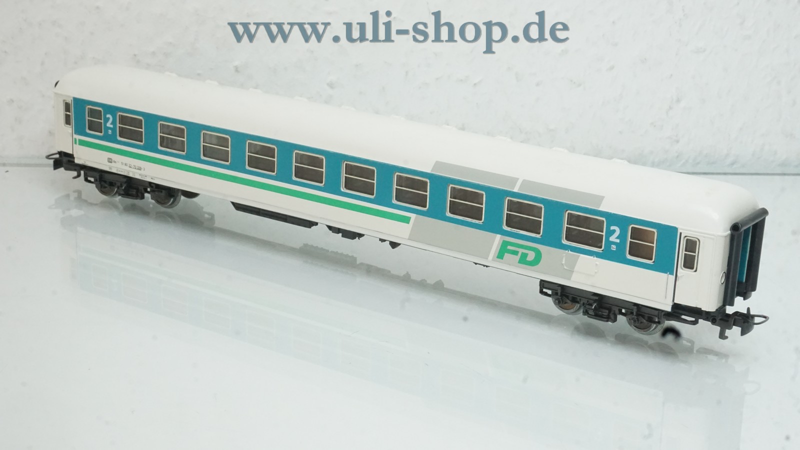 Märklin H0 Personenwagen mit der Artikelnummer 4221 türkis-weiß 2. Klasse FD. Der Artikel ist für den Betrieb mit Wechselstrom vorgesehen. Die Originalverpackung ist vorhanden. Bei der Verschmutzung, die etwa rechts unten auf den Bildern zu sehen ist, handelt es um eine Verschmutzung der Linse und nicht des Modells.