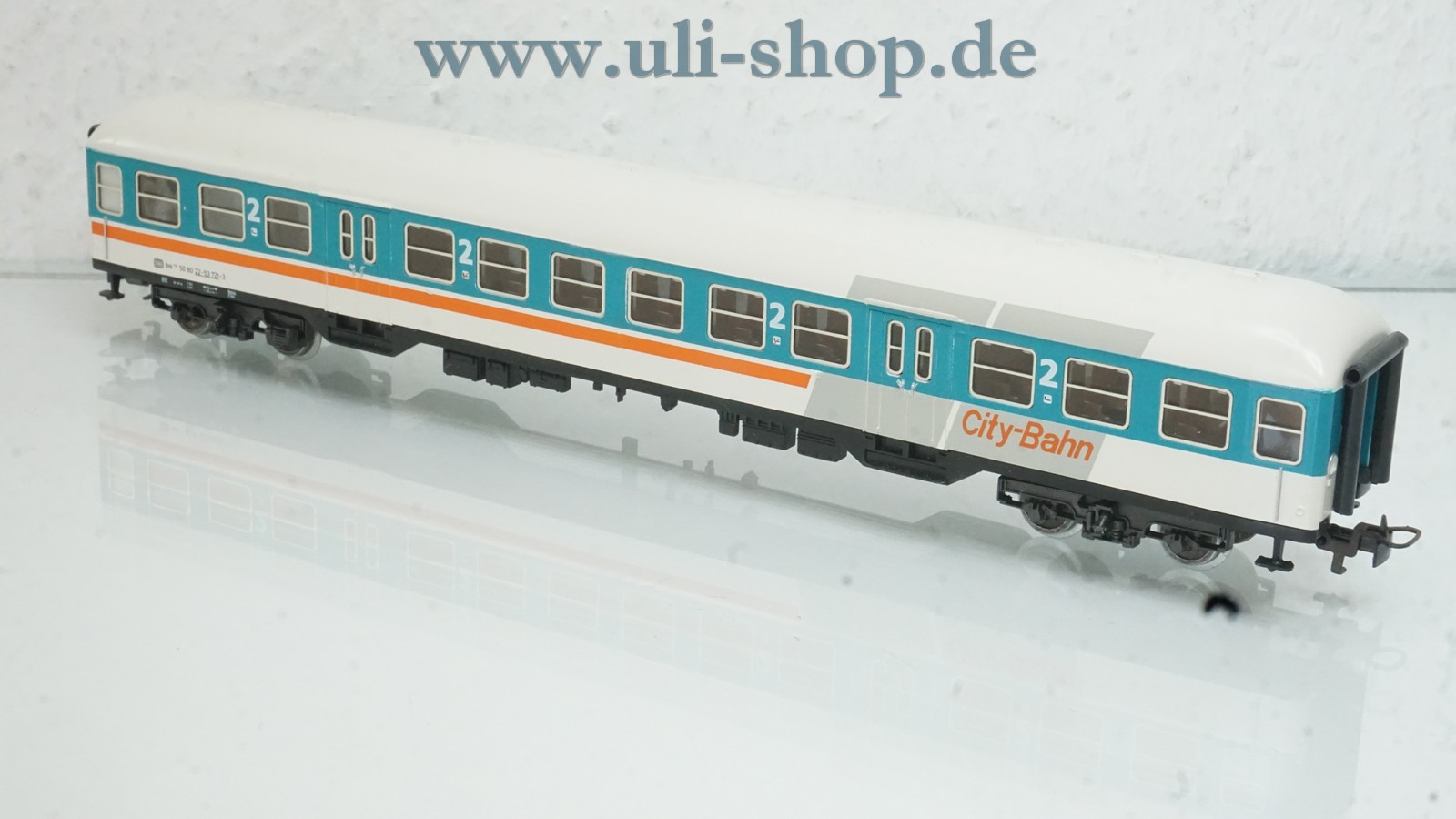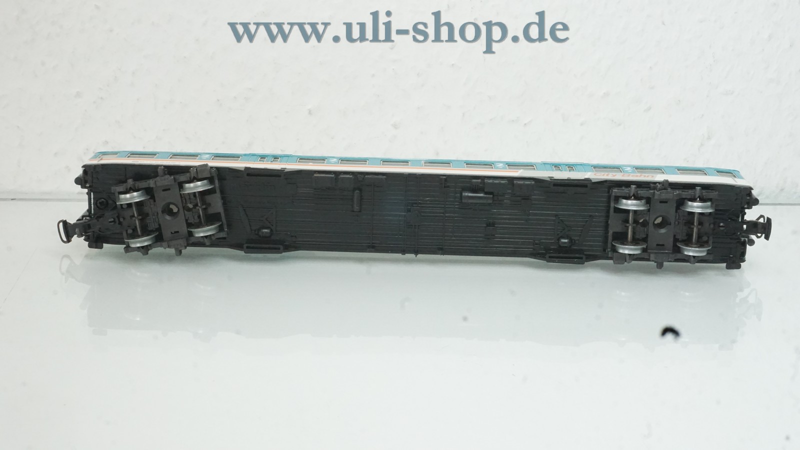 Märklin H0 Personenwagen mit der Artikelnummer 4222 weiß-türkis der DB City-Bahn. Der Artikel ist für den Betrieb mit Wechselstrom vorgesehen. Die Originalverpackung ist vorhanden. Bei der Verschmutzung, die etwa rechts unten auf den Bildern zu sehen ist, handelt es um eine Verschmutzung der Linse und nicht des Modells.