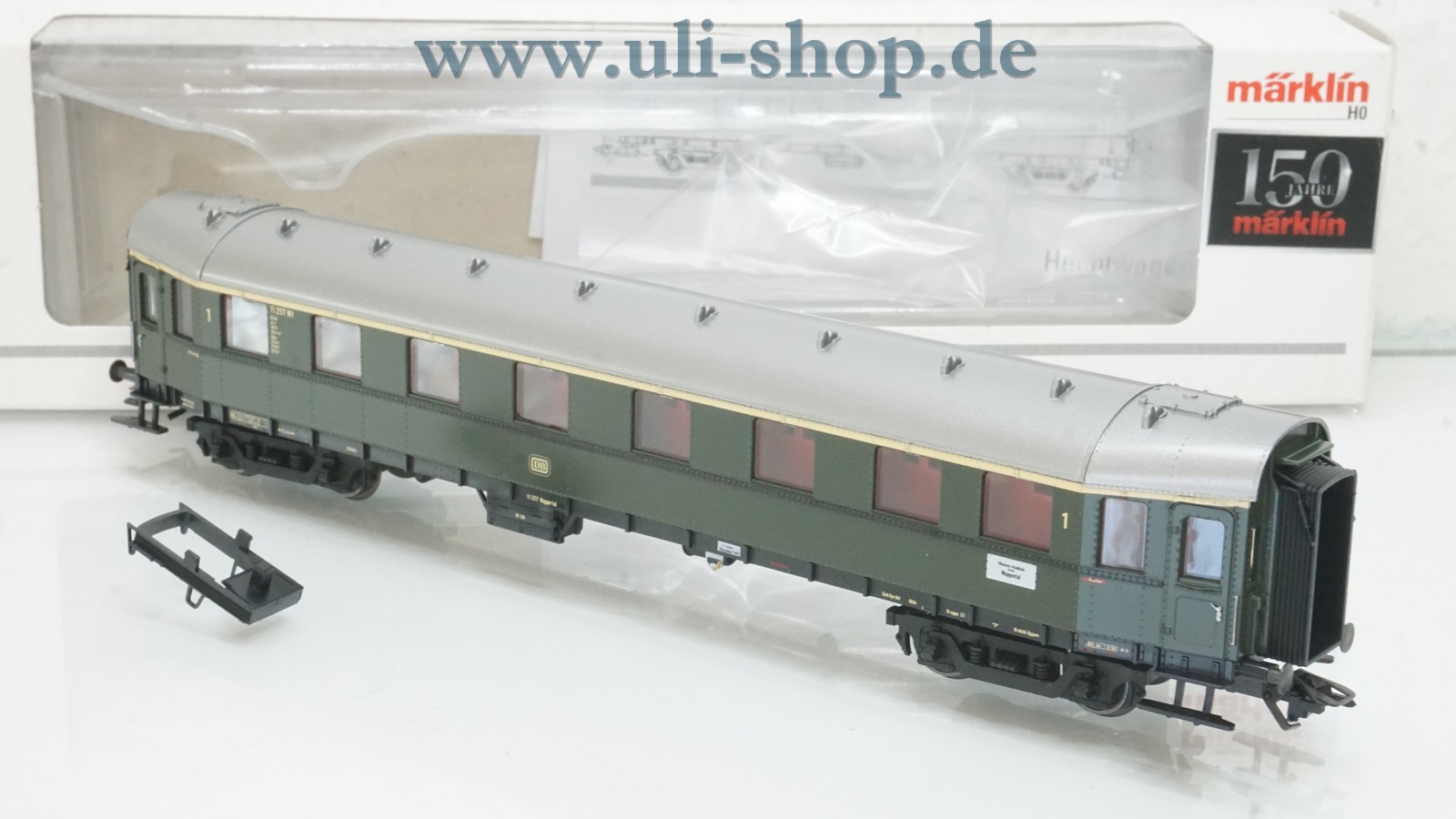 Märklin H0 Personenwagen mit der Artikelnummer 42230 Schnellzugwagen 'Hecht' 1. Klasse der DB. Der Artikel ist für den Betrieb mit Wechselstrom vorgesehen. Die Originalverpackung ist vorhanden.