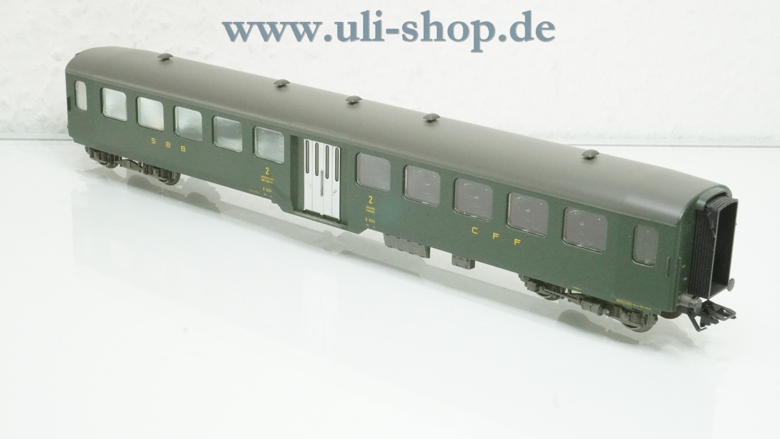 Märklin H0 Personenwagen mit der Artikelnummer 43380 Leichtstahl-Sitzwagen 2. Klasse Mitteieinstieg der SBB. Der Artikel ist für den Betrieb mit Wechselstrom vorgesehen. Die Originalverpackung ist vorhanden.
