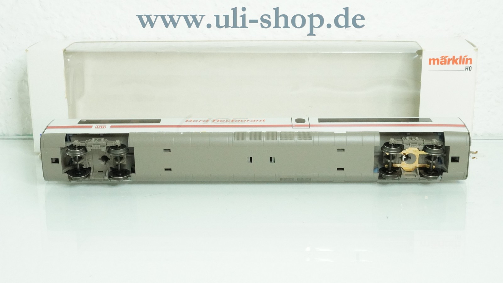 Märklin H0 Personenwagen mit der Artikelnummer 43731 ICE 1 Bord Restaurant 804 005-7 der DB AG. Der Artikel ist für den Betrieb mit Wechselstrom vorgesehen. Die Originalverpackung ist vorhanden.