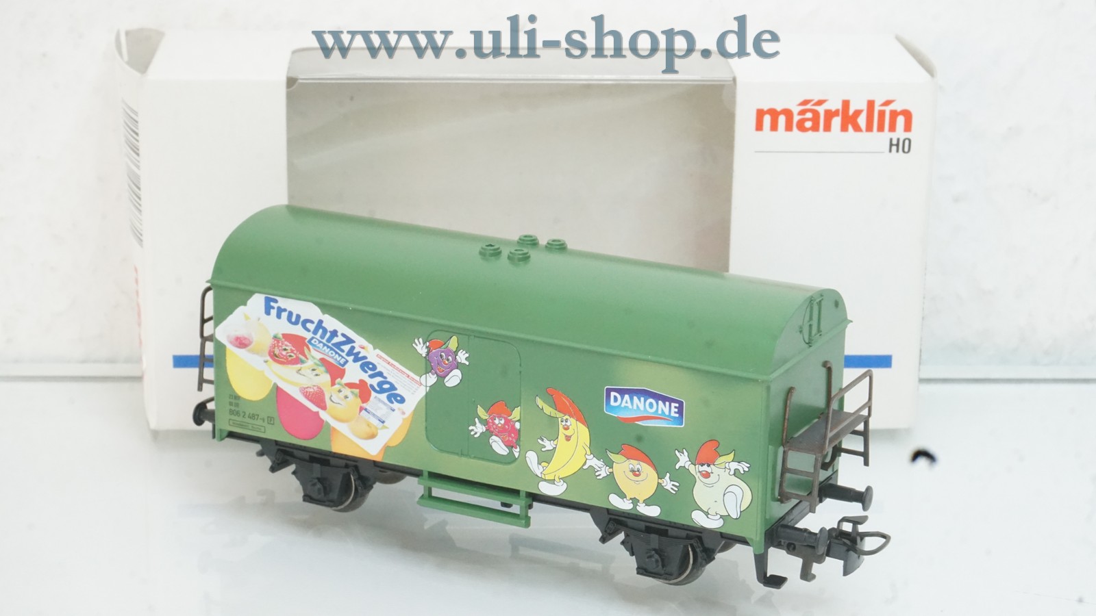 Märklin H0 Güterwagen mit der Artikelnummer 44177 Kühlwagen Fruchtzwerge. Der Artikel ist für den Betrieb mit Wechselstrom vorgesehen. Die Originalverpackung ist vorhanden. Bei der Verschmutzung, die etwa rechts unten auf den Bildern zu sehen ist, handelt es um eine Verschmutzung der Linse und nicht des Modells.