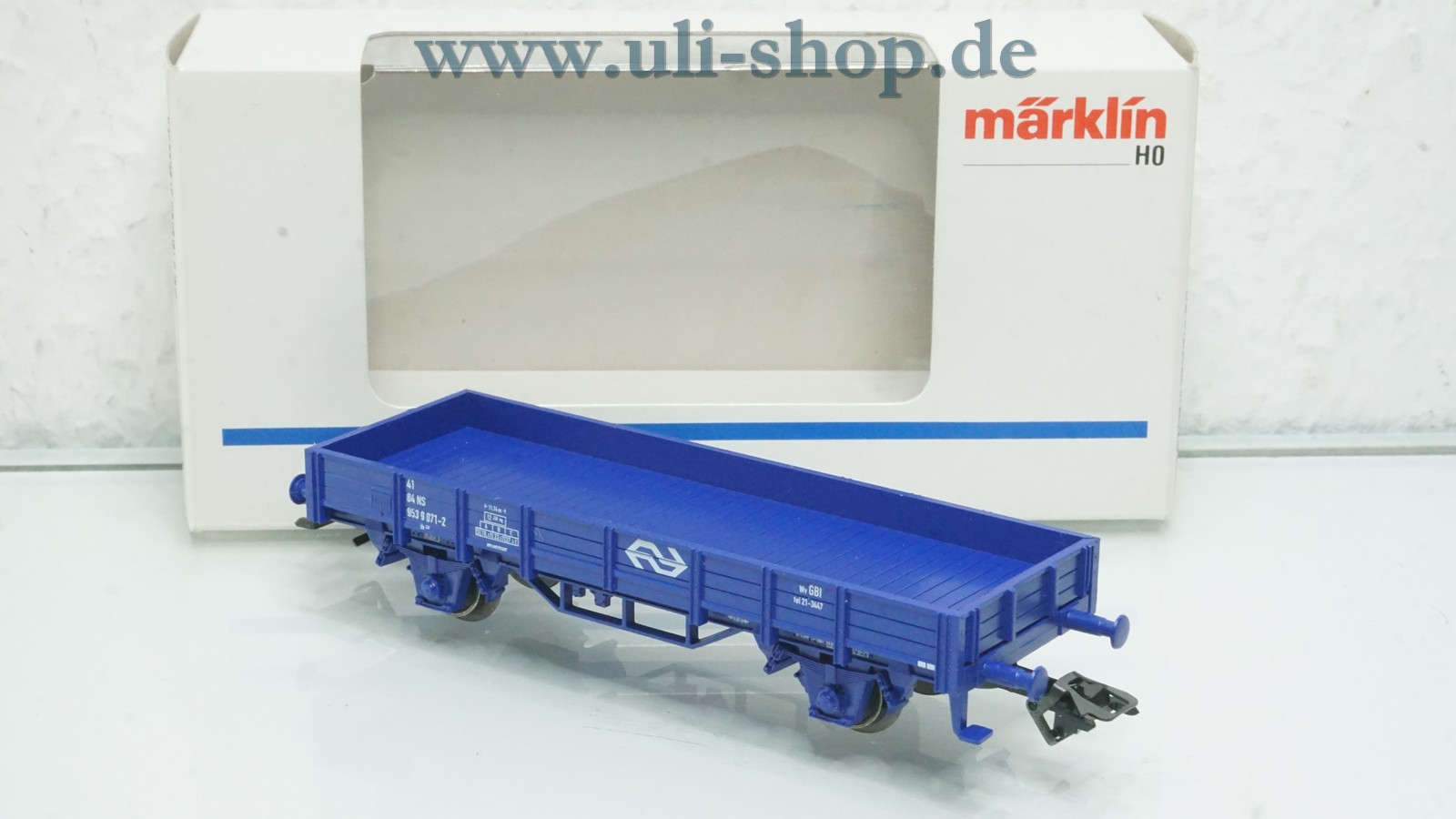 Märklin H0 Güterwagen mit der Artikelnummer 4433 Niederbordwagen der NS blau. Der Artikel ist für den Betrieb mit Wechselstrom vorgesehen. Die Originalverpackung ist vorhanden.