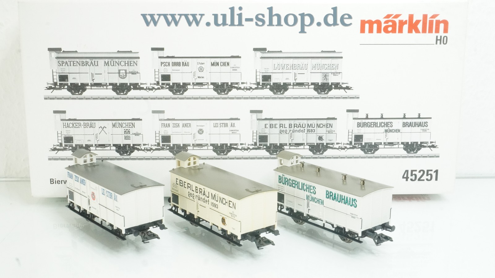 Märklin H0 Wagenpackung mit der Artikelnummer 45251 Bierwagen mit Bremserhaus Ep. I. Der Artikel ist für den Betrieb mit Wechselstrom vorgesehen. Die Originalverpackung ist vorhanden.