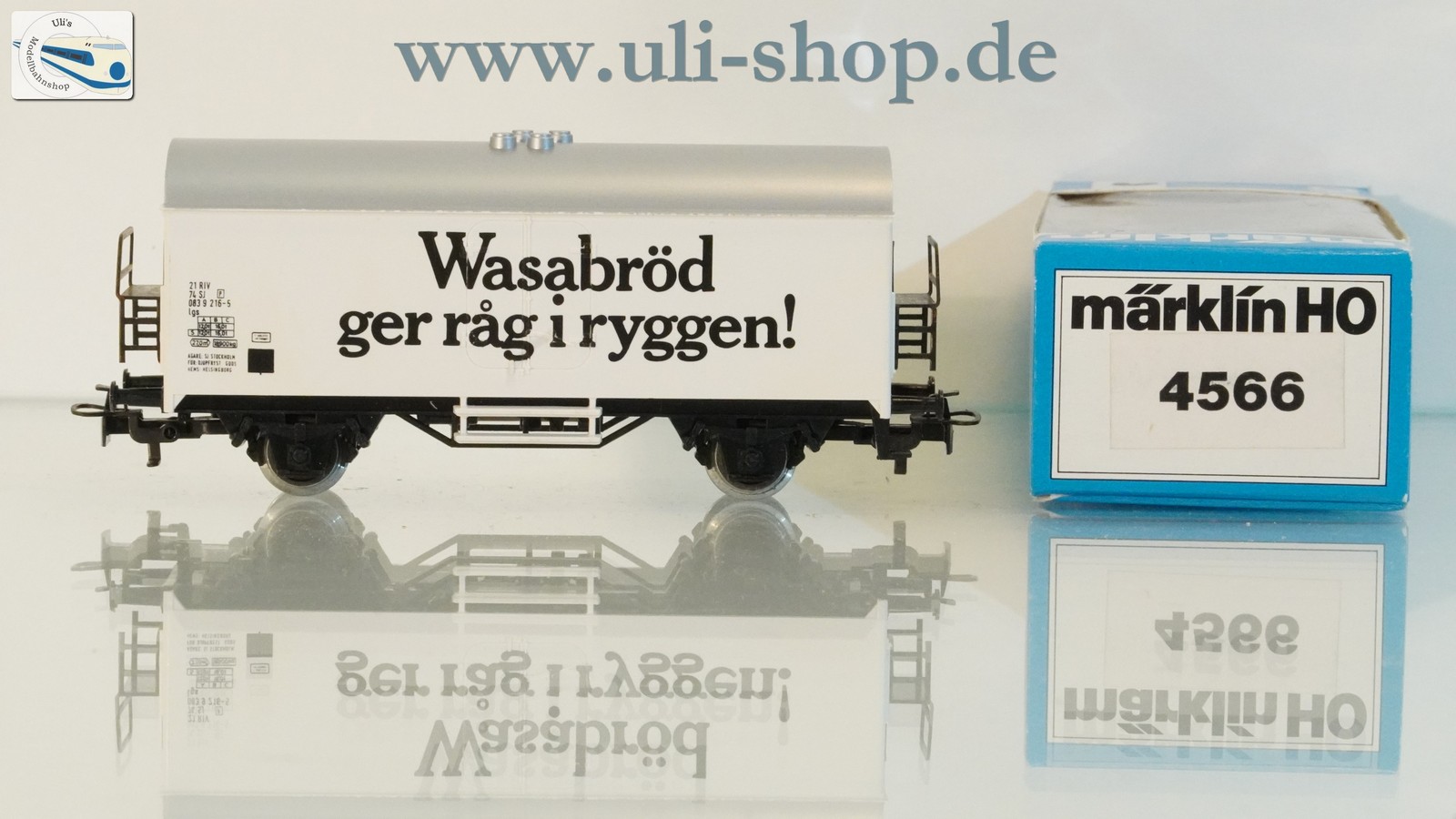 Märklin H0 Güterwagen mit der Artikelnummer 4566 gedeckt Wasabröd. Der Artikel ist für den Betrieb mit Wechselstrom vorgesehen. Die Originalverpackung ist vorhanden.