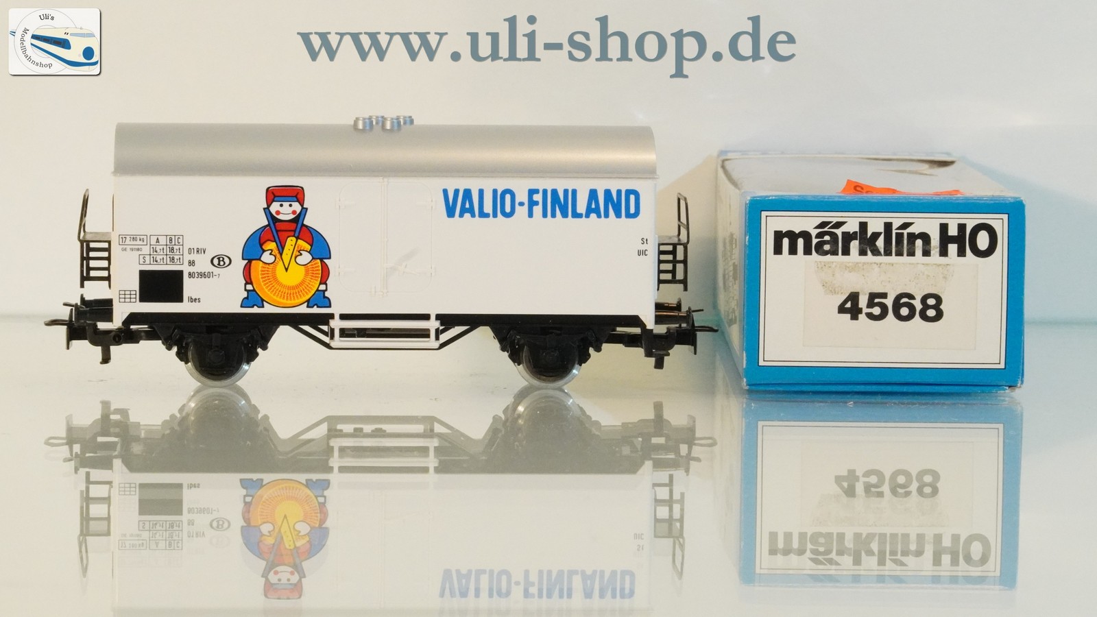 Märklin H0 Güterwagen mit der Artikelnummer 4568 Kühlwagen VALIO-FINLAND. Der Artikel ist für den Betrieb mit Wechselstrom vorgesehen. Die Originalverpackung ist vorhanden.