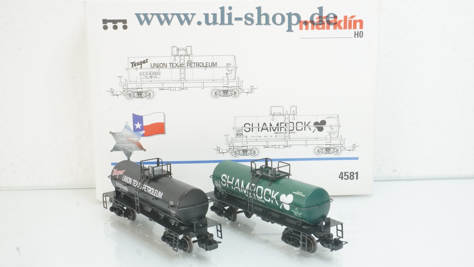 Märklin H0 Wagenpackung mit der Artikelnummer 4581 Texas USA Tank Cars. Der Artikel ist für den Betrieb mit Wechselstrom vorgesehen. Die Originalverpackung ist vorhanden.