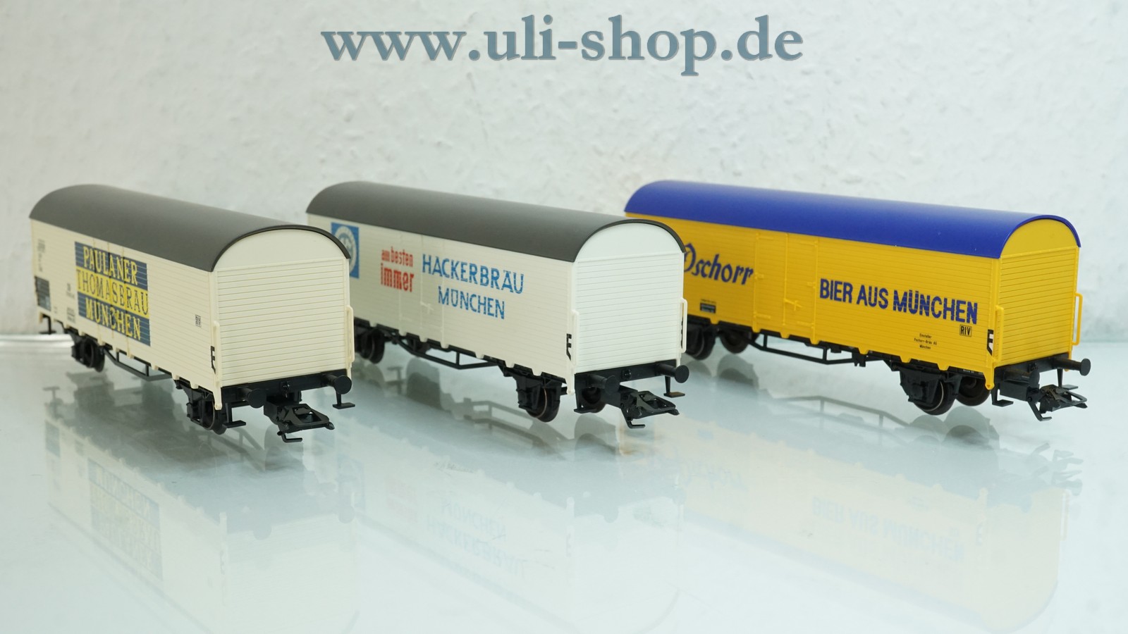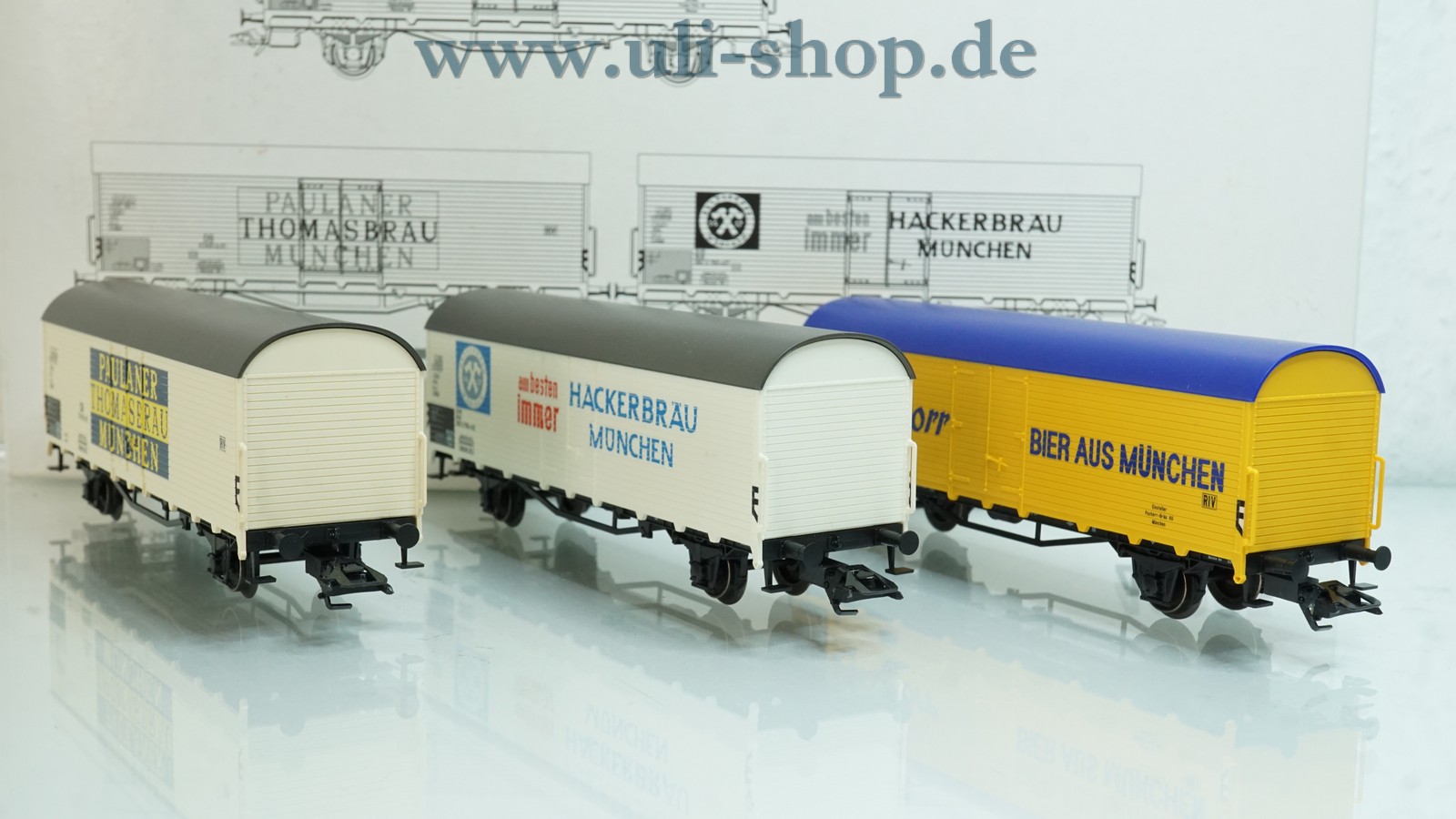 Märklin H0 Wagenpackung mit der Artikelnummer 46203 Bierwagen-Set "Münchner Brauereien". Der Artikel ist für den Betrieb mit Wechselstrom vorgesehen. Die Originalverpackung ist vorhanden.