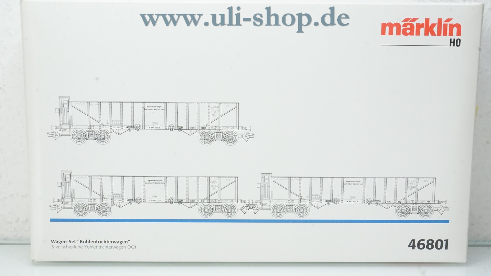 Märklin H0 Wagenpackung mit der Artikelnummer 46801 Kohlentrichterwagen der K.Bay.Sts.B. Der Artikel ist für den Betrieb mit Wechselstrom vorgesehen. Die Originalverpackung ist vorhanden.
