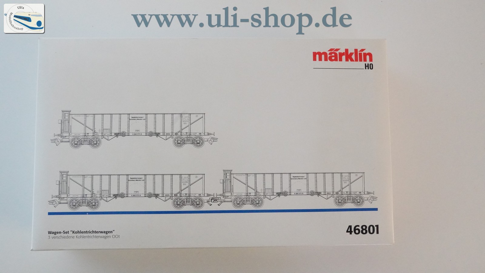Märklin H0 Wagenpackung mit der Artikelnummer 46801 "Kohlentrichterwagen". Der Artikel ist für den Betrieb mit Wechselstrom vorgesehen. Die Originalverpackung ist vorhanden.