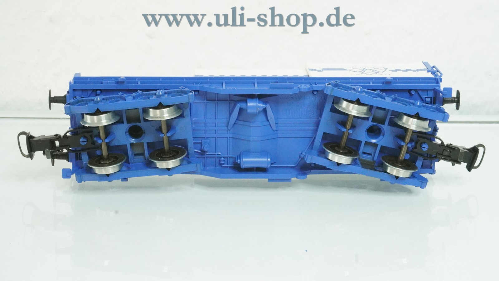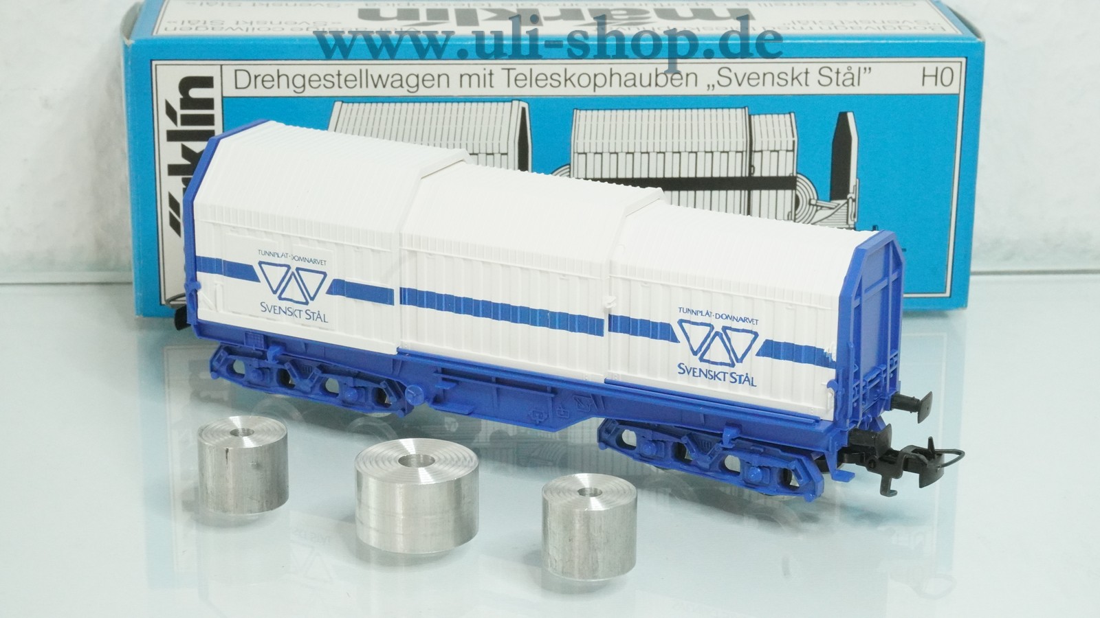 Märklin H0 Güterwagen mit der Artikelnummer 4688 Teleskophaubenwagen Svenskt Stal. Der Artikel ist für den Betrieb mit Wechselstrom vorgesehen. Die Originalverpackung ist vorhanden.