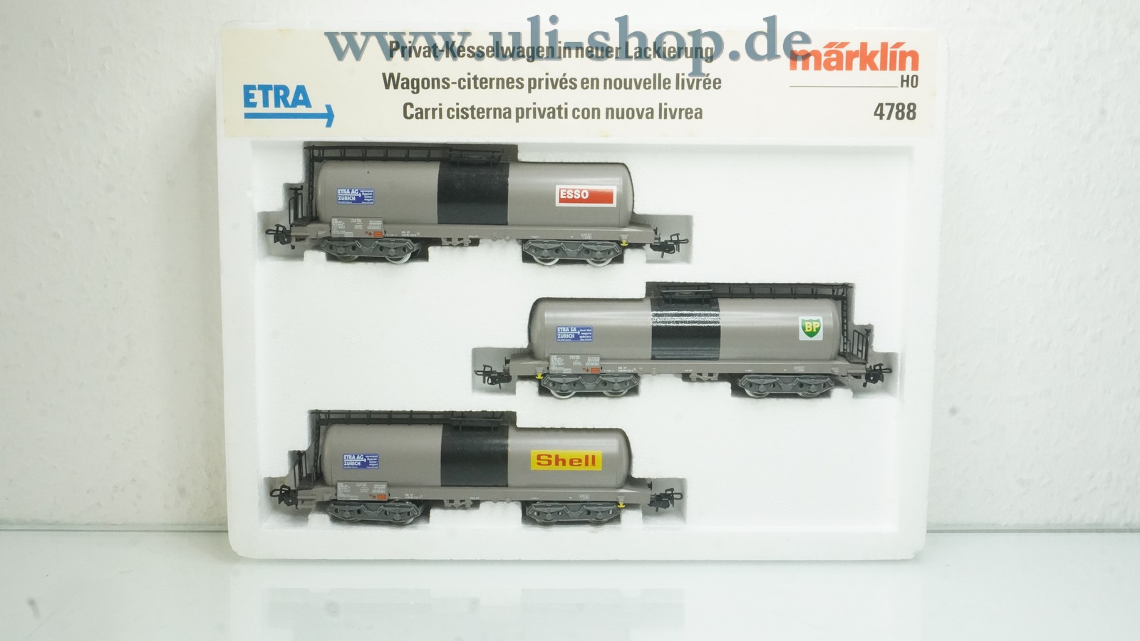 Märklin H0 Wagenpackung mit der Artikelnummer 4788 Kesselwagen der SBB "ETRA AG Zürich". Der Artikel ist für den Betrieb mit Wechselstrom vorgesehen. Die Originalverpackung ist vorhanden.