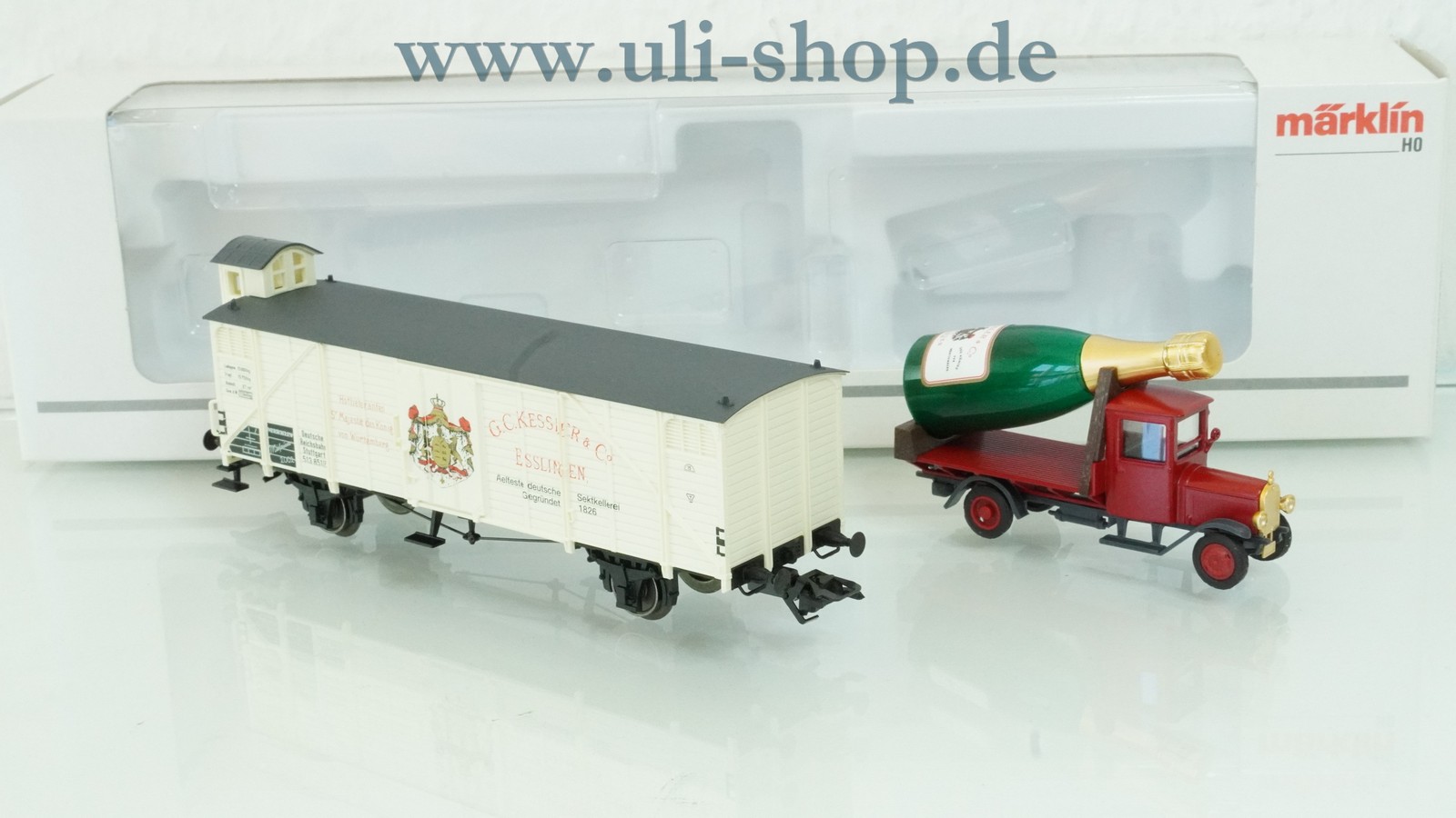 Märklin H0 Güterwagen mit der Artikelnummer 48002 Museumswagen 2002 G. C. Kessler Esslingen mit LKW. Der Artikel ist für den Betrieb mit Wechselstrom vorgesehen. Die Originalverpackung ist vorhanden.