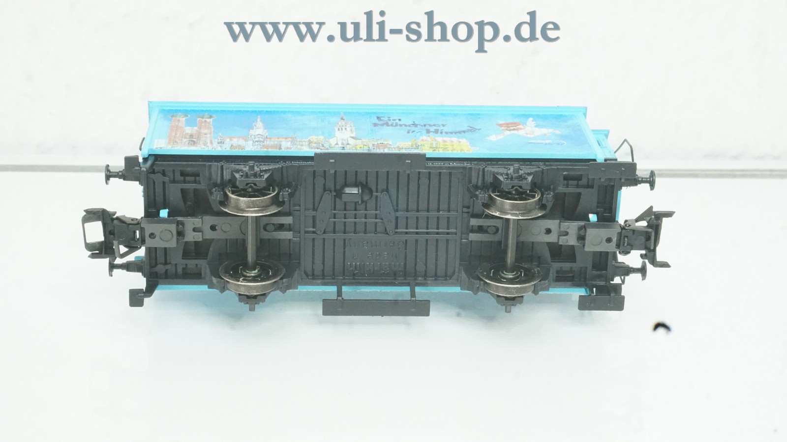 Märklin H0 Güterwagen mit der Artikelnummer 48299 gedeckt mit Bremserhaus "Ein Münchner im Himmel". Der Artikel ist für den Betrieb mit Wechselstrom vorgesehen. Die Originalverpackung ist vorhanden. Bei der Verschmutzung, die etwa rechts unten auf den Bildern zu sehen ist, handelt es um eine Verschmutzung der Linse und nicht des Modells.