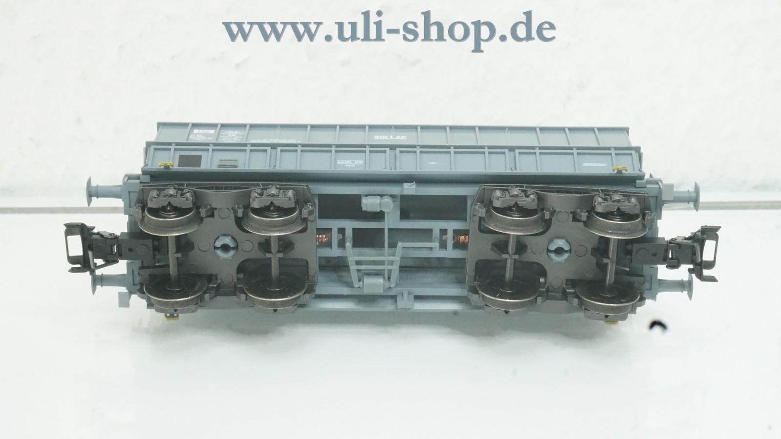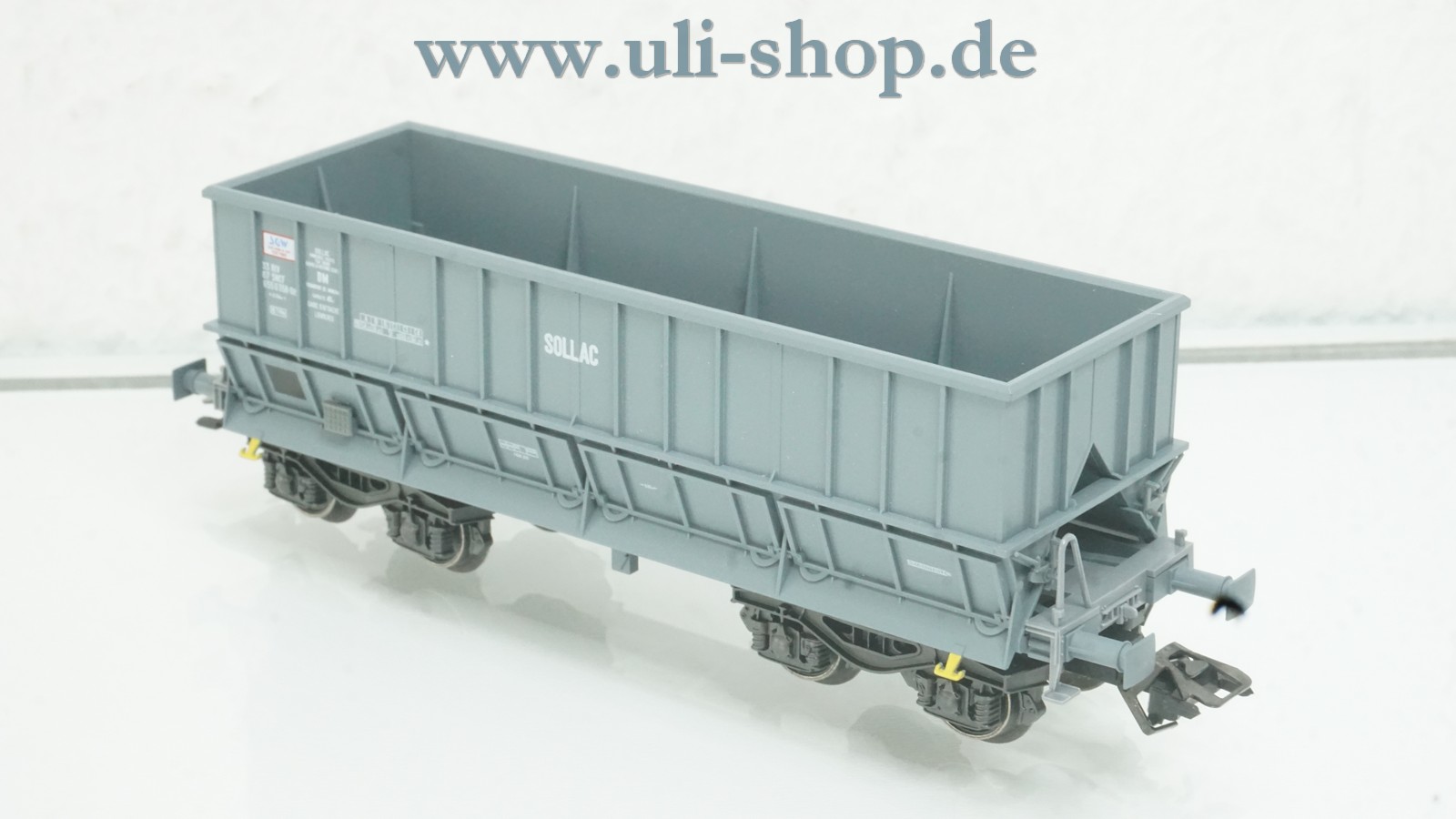 Märklin H0 Güterwagen mit der Artikelnummer 48441 Erz Transportwagen SOLLAC SNCF grau. Der Artikel ist für den Betrieb mit Wechselstrom vorgesehen. Die Originalverpackung ist vorhanden. Bei der Verschmutzung, die etwa rechts unten auf den Bildern zu sehen ist, handelt es um eine Verschmutzung der Linse und nicht des Modells.