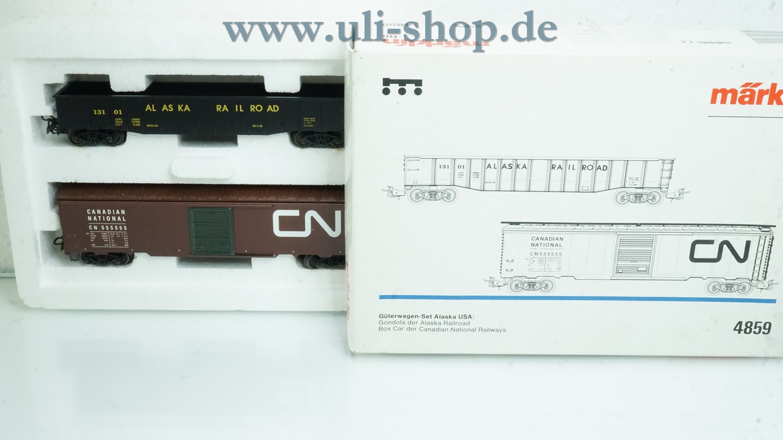 Märklin H0 Wagenpackung mit der Artikelnummer 4859 Alaska USA Gondola + Box Car Tin Plate. Der Artikel ist für den Betrieb mit Wechselstrom vorgesehen. Die Originalverpackung ist vorhanden.
