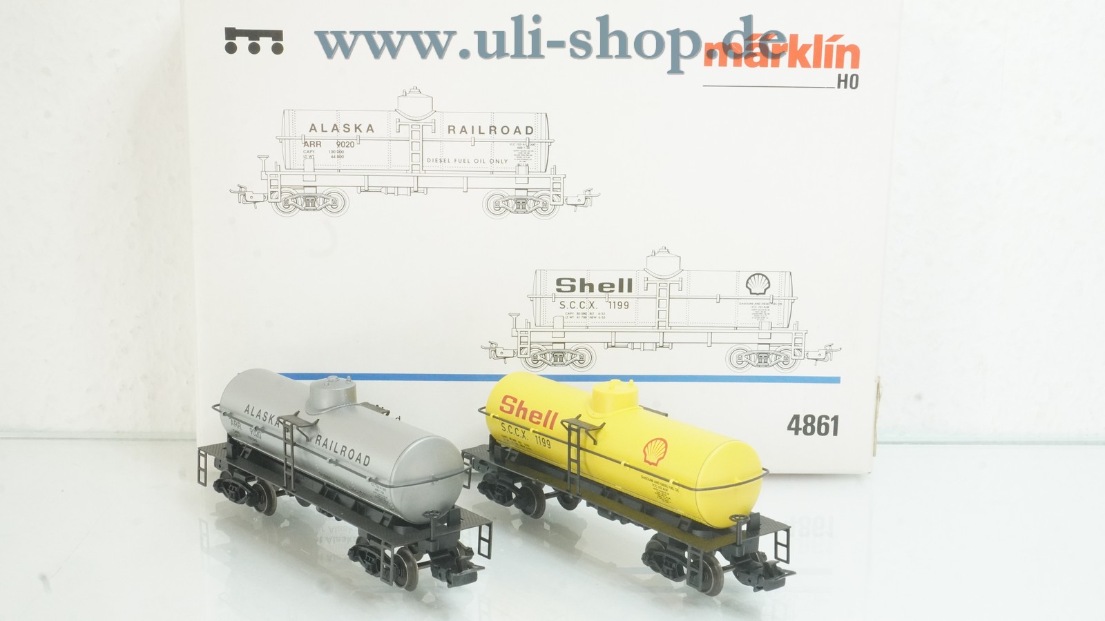 Märklin H0 Wagenpackung mit der Artikelnummer 4861 Alaska USA Tank Cars. Der Artikel ist für den Betrieb mit Wechselstrom vorgesehen. Die Originalverpackung ist vorhanden.