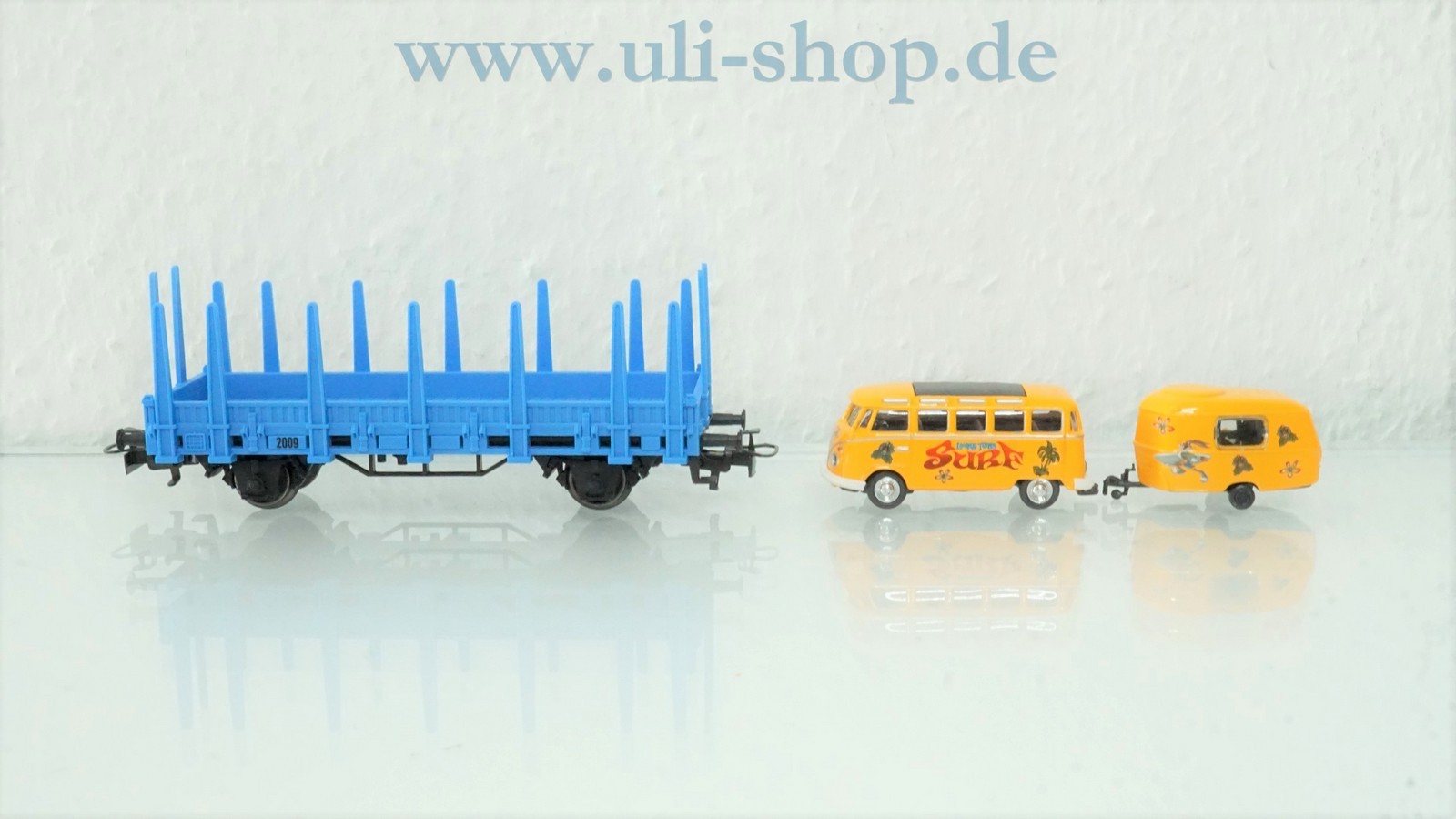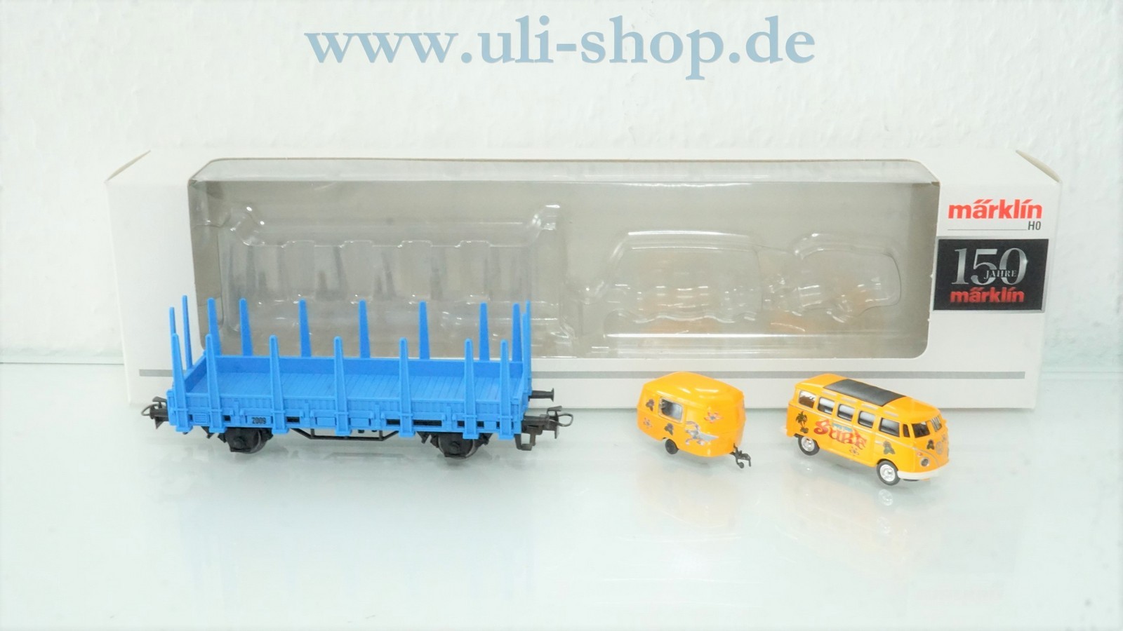 Märklin H0 Güterwagen mit der Artikelnummer 48709 Jahreswagen 2009 "1. FC Märklin" Rungenwagen mit Bus und Wohnanhänger. Der Artikel ist für den Betrieb mit Wechselstrom vorgesehen. Die Originalverpackung ist vorhanden.