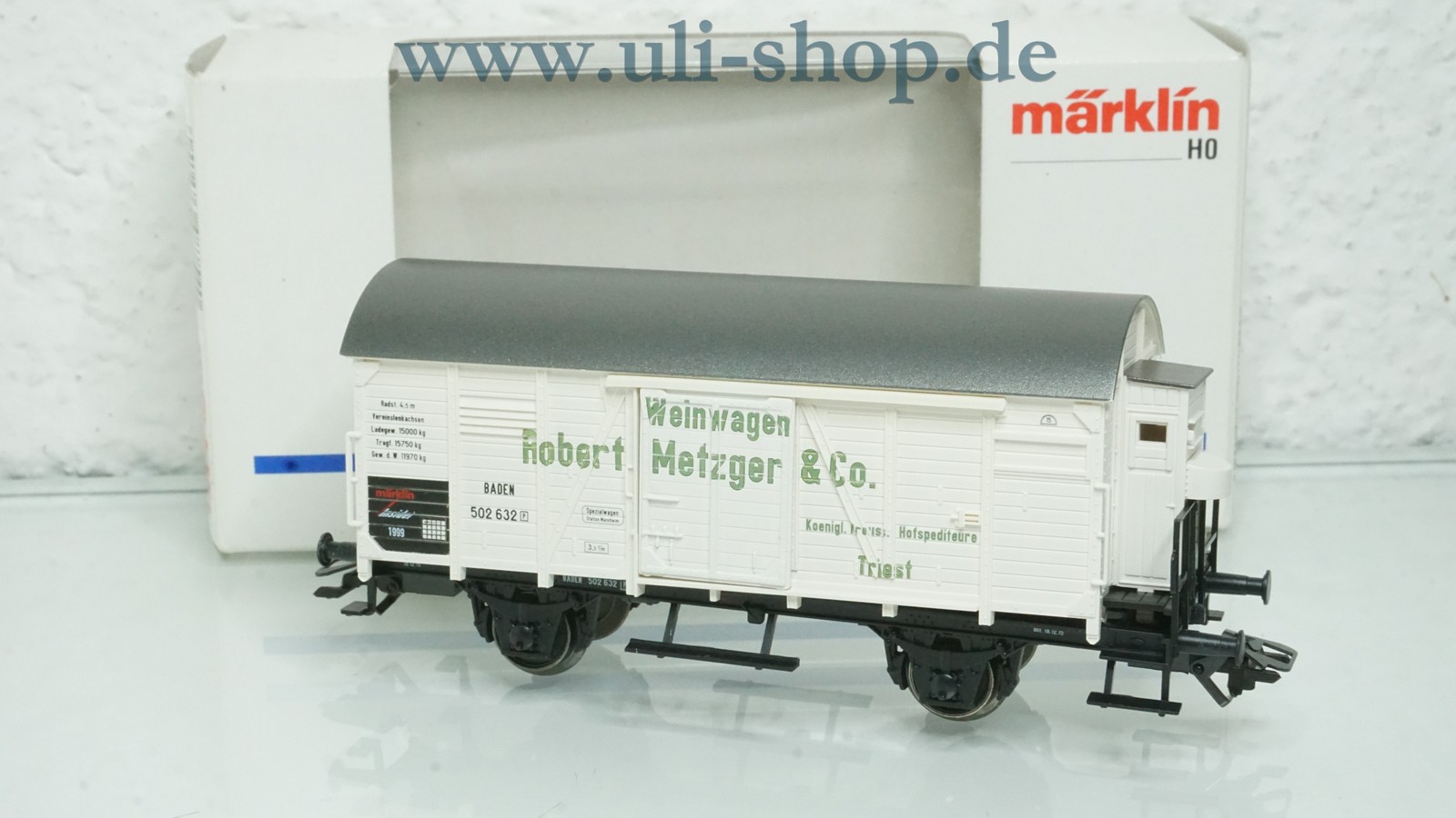 Märklin H0 Güterwagen mit der Artikelnummer 48754 Jahreswagen 1999 Weinwagen "Robert Metzger". Der Artikel ist für den Betrieb mit Wechselstrom vorgesehen. Die Originalverpackung ist vorhanden.
