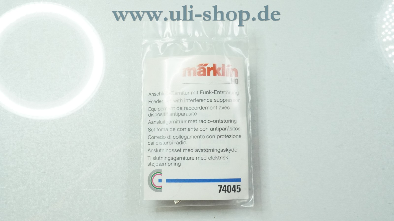 Märklin H0 mit der Artikelnummer 74045 Anschluss-Garnitur mit Funk-Entstörung für C-Gleis. Die Originalverpackung ist vorhanden.