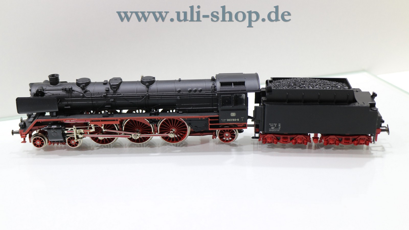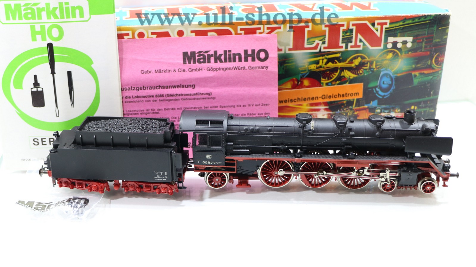 Märklin H0 Dampflok mit der Artikelnummer 8385 Br. 003 160-9 der DB. Der Artikel ist für den Betrieb mit Gleichstrom vorgesehen. Die Lok ist analog, sie kann daher nicht auf digital gesteuerten Anlagen fahren. Die Originalverpackung ist vorhanden. .