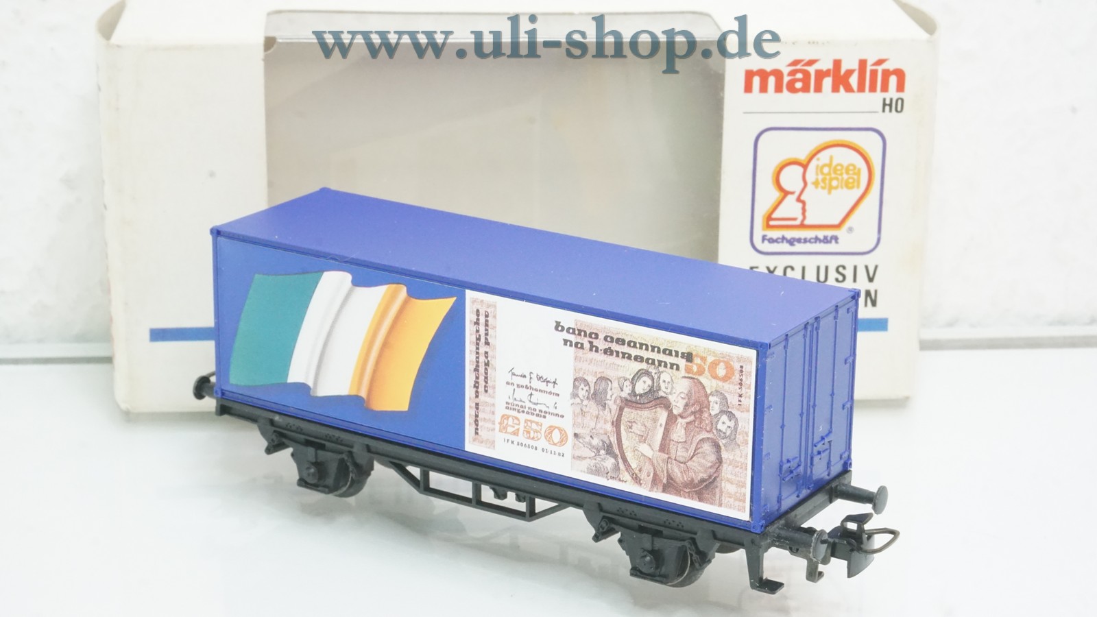 Märklin H0 Güterwagen mit der Artikelnummer 84572 Containerwagen Europa 1993 Irland. Der Artikel ist für den Betrieb mit Wechselstrom vorgesehen. Die Originalverpackung ist vorhanden.