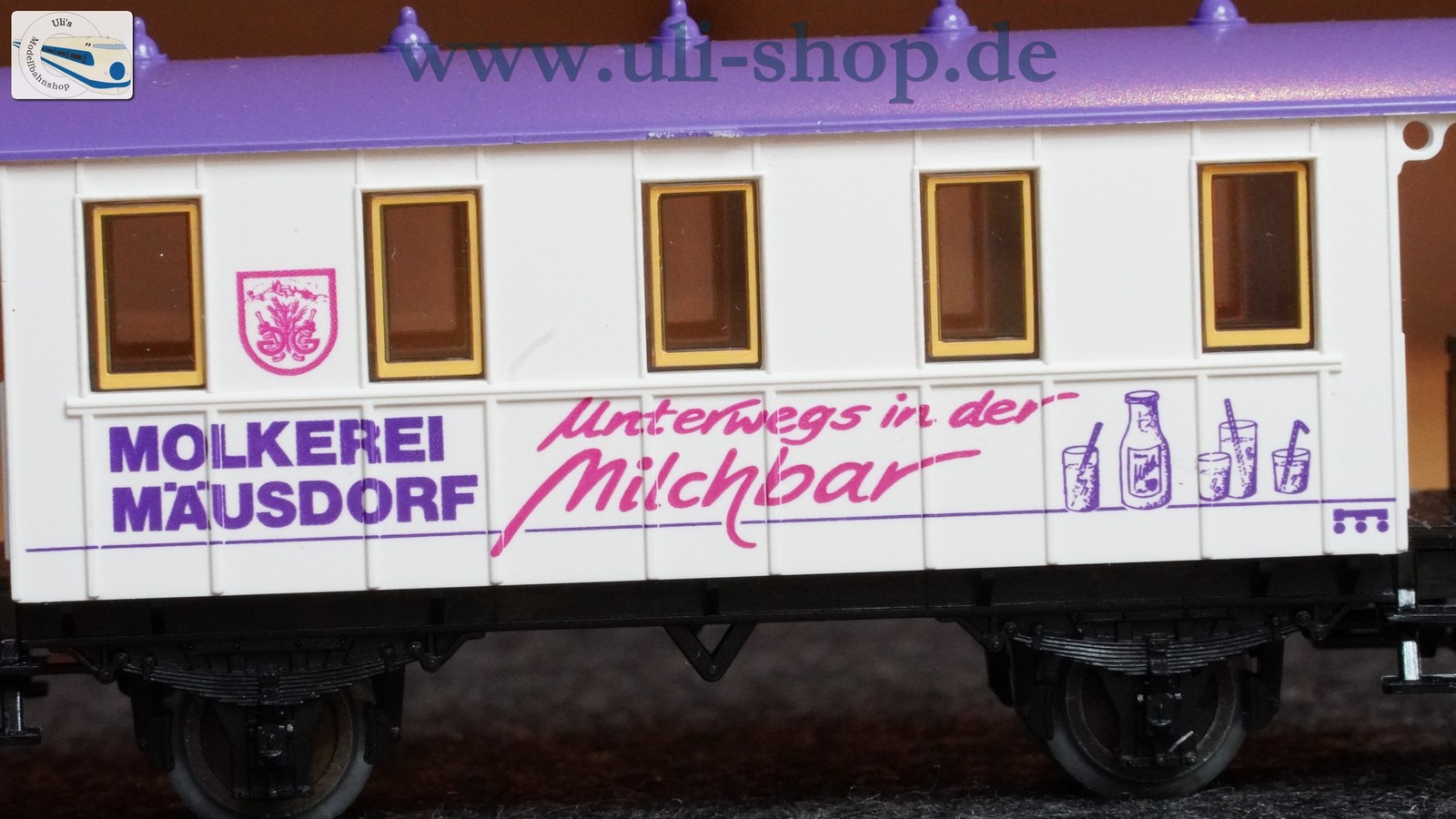 Märklin H0 Personenwagen Sondermodell Molkerei Mäusdorf . Der Zustand ist neuwertig. Der Artikel ist für den Betrieb mit Wechselstrom vorgesehen. Die Originalverpackung (OVP) ist vorhanden.
