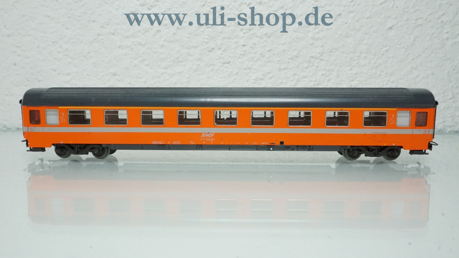 Märklin H0 vierachsiger Personenwagen der SNCF. Der Artikel ist für den Betrieb mit Wechselstrom vorgesehen. Der Wagen hat einige Farbspritzer auf einer Seite. Am Dach hat er eine Klebespur.