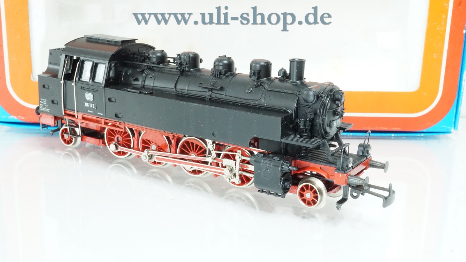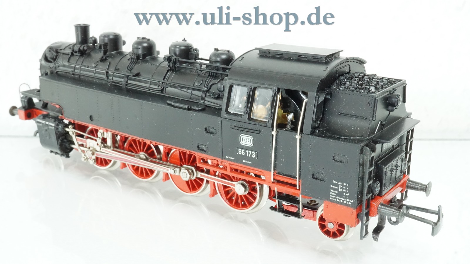 Märklin-Hamo H0 Dampflok mit der Artikelnummer 8396 Br. 86 173 der DB. Der Artikel ist für den Betrieb mit Gleichstrom vorgesehen. Die Lok ist analog, sie kann daher nicht auf digital gesteuerten Anlagen fahren. Die Originalverpackung ist vorhanden.
