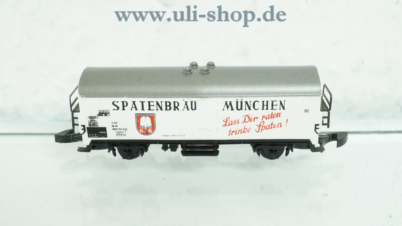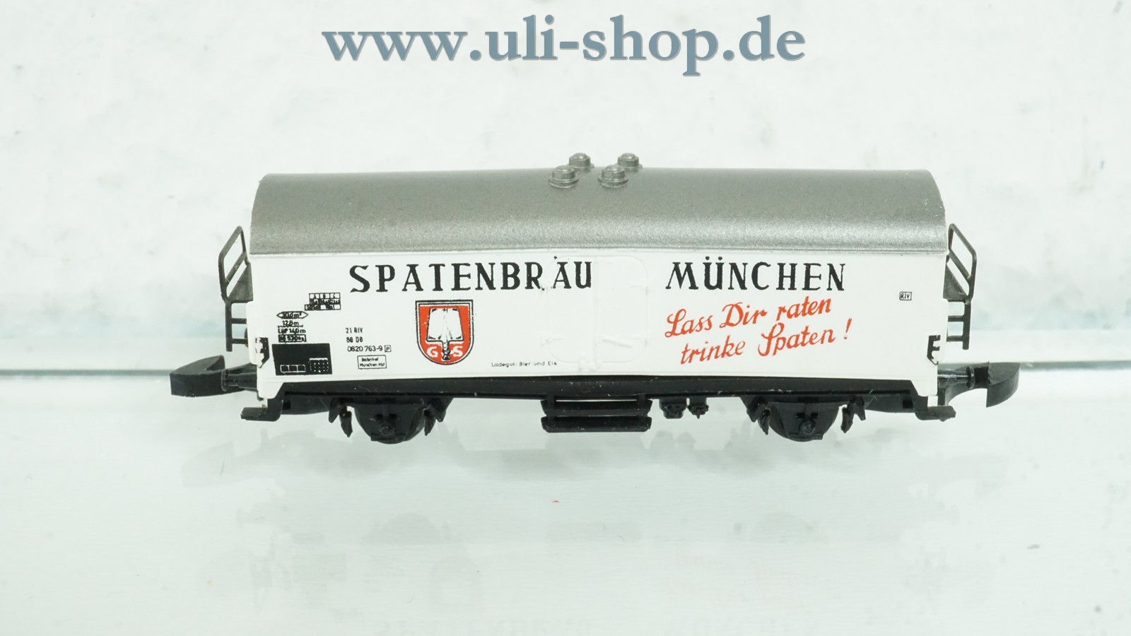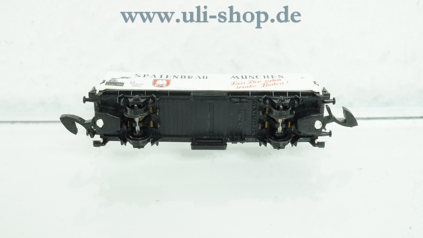 Märklin mini-club Z mit der Artikelnummer 8602 Bierwagen Spatenbräu München (AX 094). Der Artikel ist für den Betrieb mit Gleichstrom vorgesehen. Die Originalverpackung ist leider nicht mehr vorhanden.