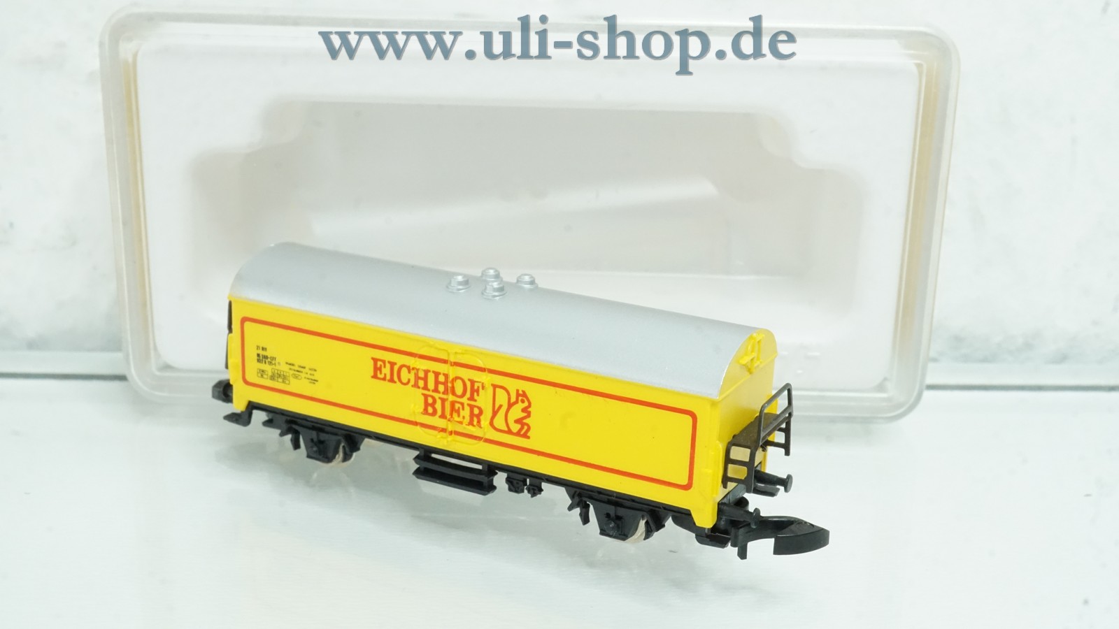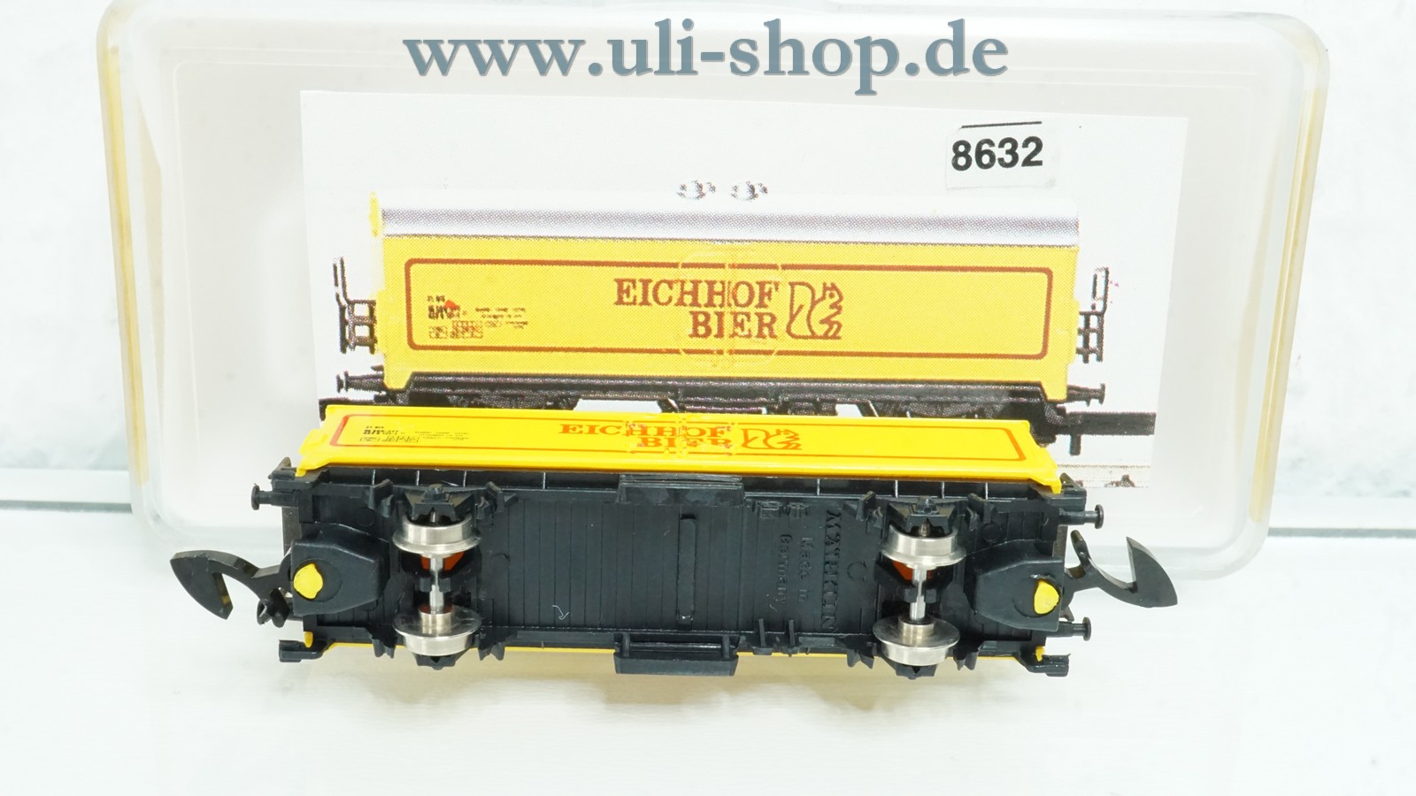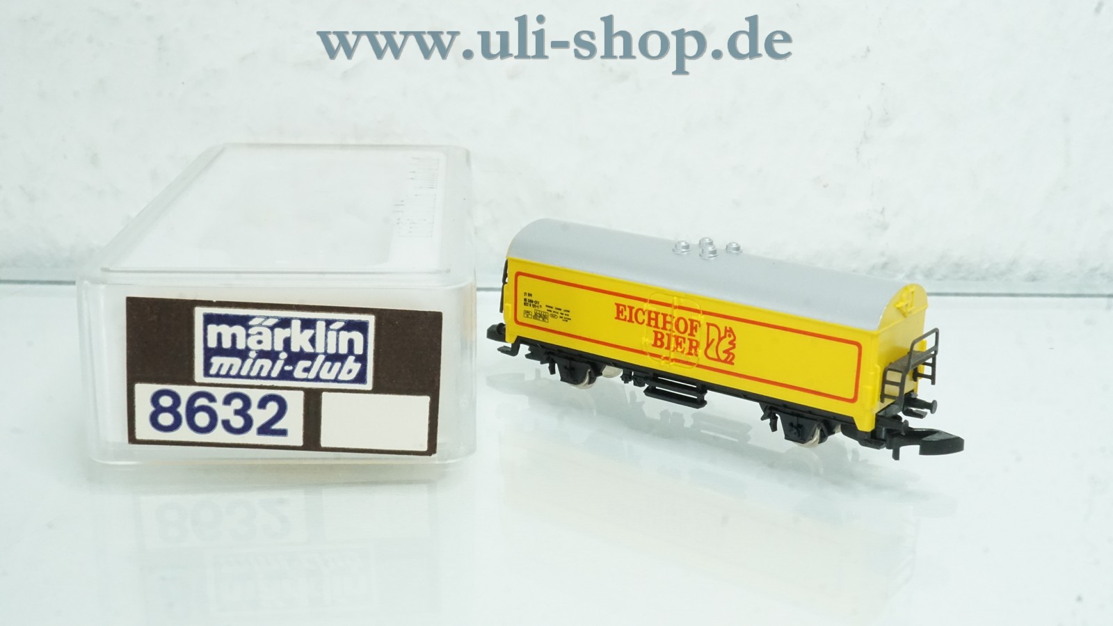 Märklin mini-club Z Güterwagen mit der Artikelnummer 8632 Bierwagen Eichhof Bier. Der Artikel ist für den Betrieb mit Gleichstrom vorgesehen. Die Originalverpackung ist vorhanden. Die OVP hat auf der Rückseite einen Aufkleber.