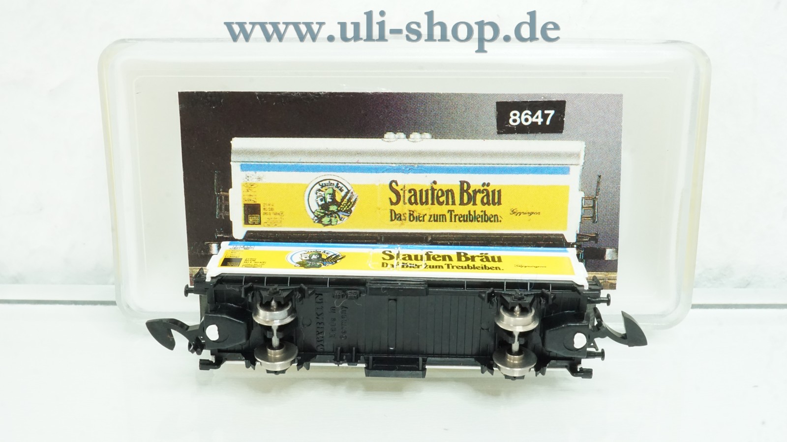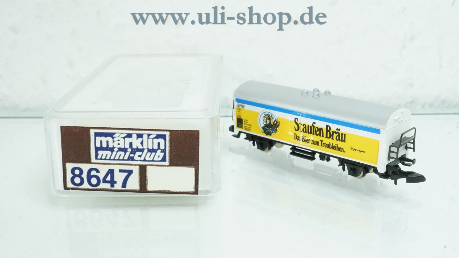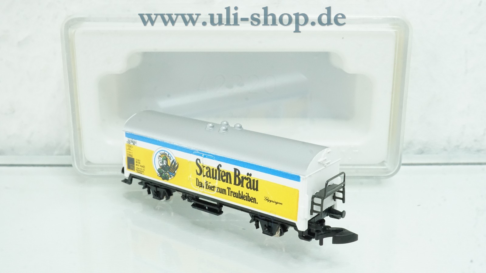 Märklin mini-club Z Güterwagen mit der Artikelnummer 8647 Bierwagen Staufenbräu. Der Artikel ist für den Betrieb mit Gleichstrom vorgesehen. Die Originalverpackung ist vorhanden. Die OVP hat auf der Rückseite einen Aufkleber.