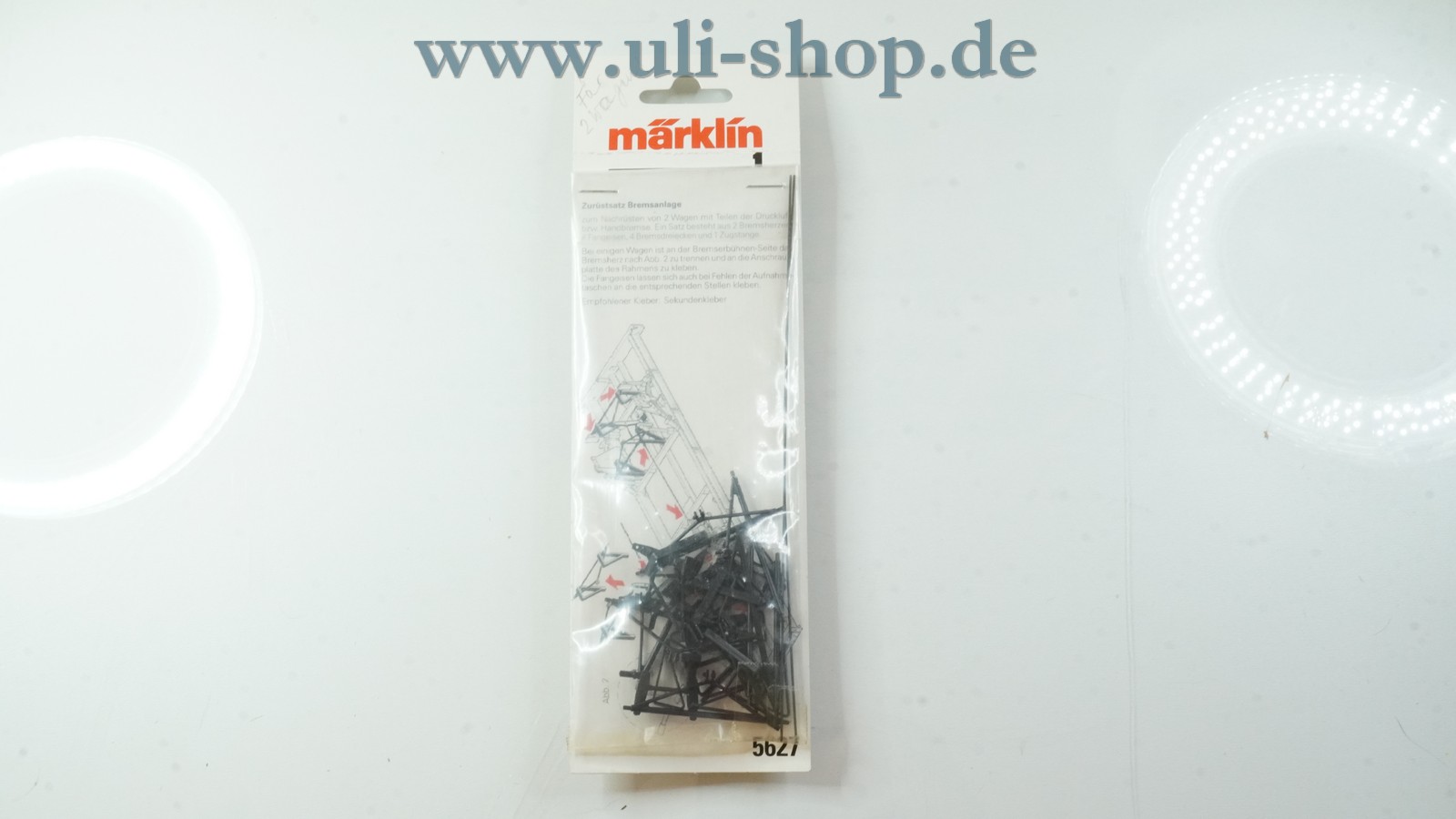 Märklin Spur 1 mit der Artikelnummer 5627 Zurüstsatz Bremsanlage für zwei Wagen. Die Originalverpackung ist vorhanden.