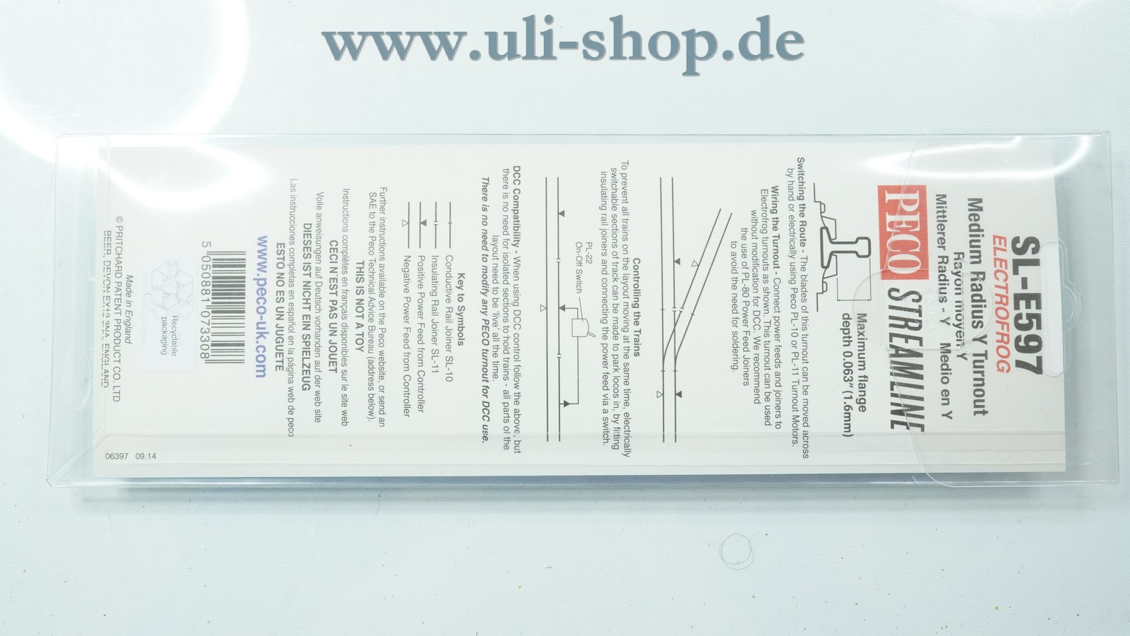 Peco H0 Gleismaterial mit der Artikelnummer SL-E597 Y-Weiche. Der Artikel ist für den Betrieb mit Gleichstrom vorgesehen. Die Originalverpackung ist vorhanden.