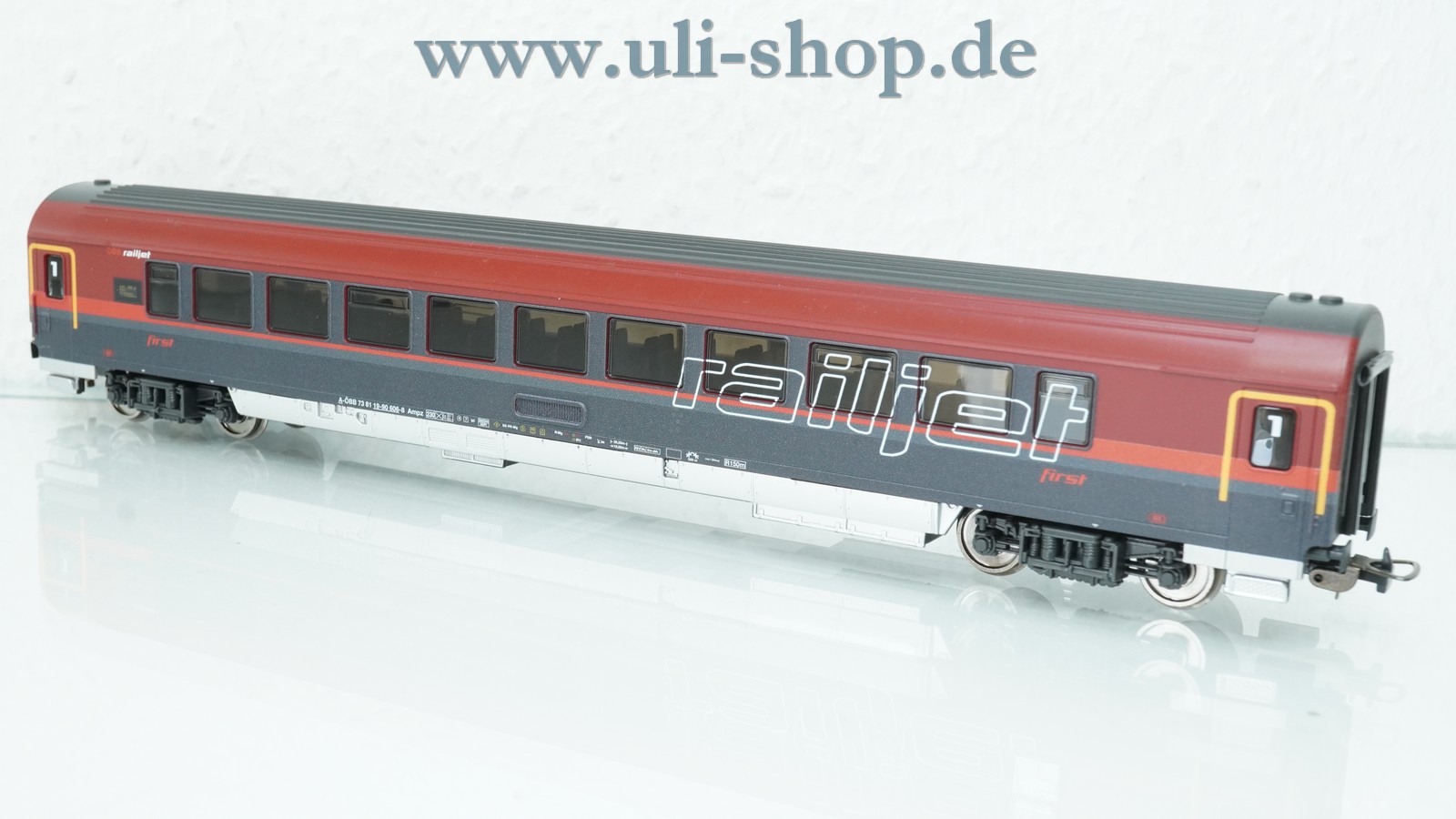 PIKO H0 Personenwagen mit der Artikelnummer 57172-01 Railjet 1. Klasse der ÖBB. Der Artikel ist für den Betrieb mit Gleichstrom vorgesehen. Die Originalverpackung ist leider nicht mehr vorhanden. Der Wagen hat die Wagennummer 73 81 19-90 606-8. Es handelt sich hier nur um einen Einzelwagen aus der Wagenpackung mit der Artikelnummer 57172.