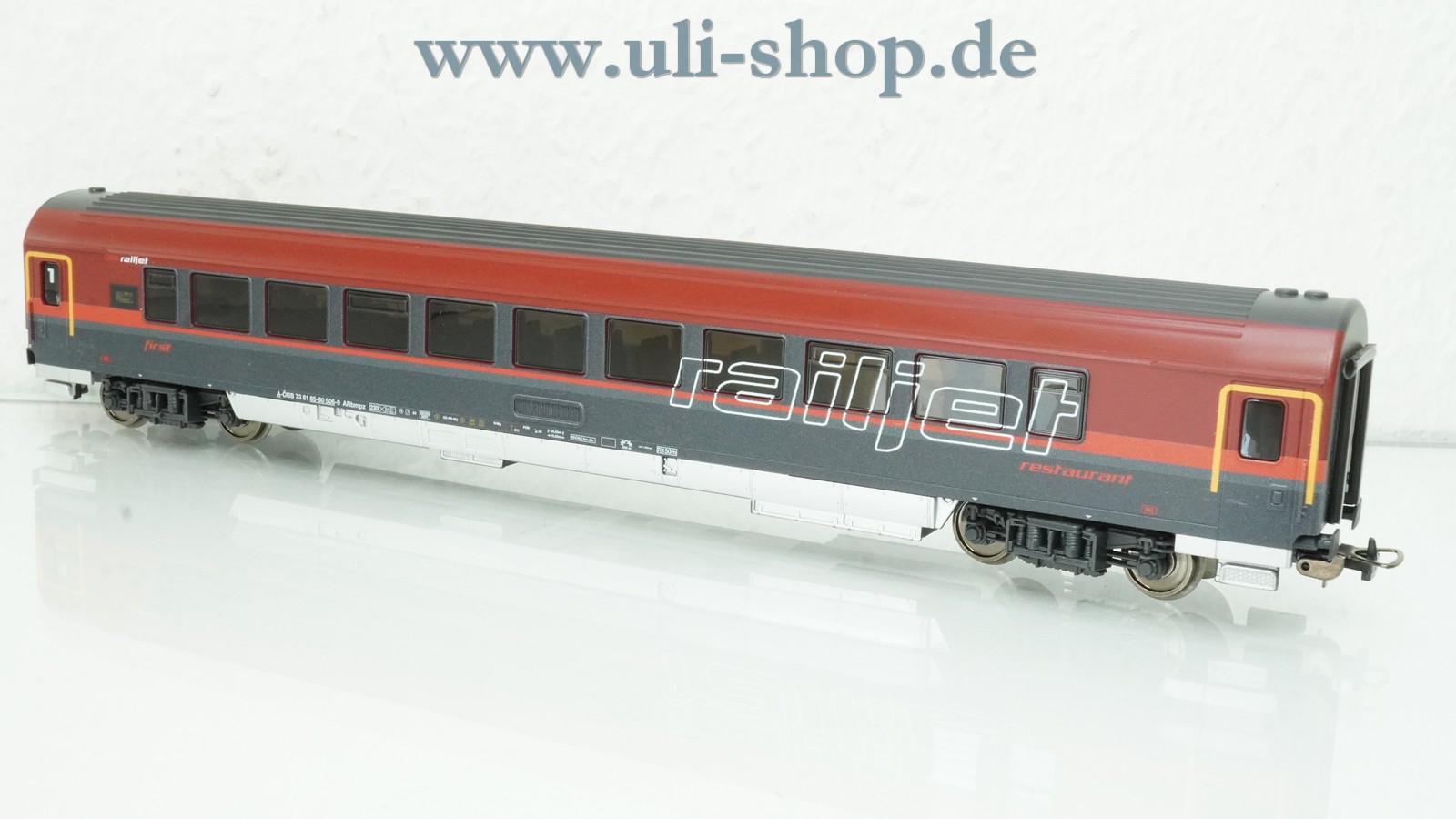 PIKO H0 Personenwagen mit der Artikelnummer 57172-02 Railjet 1. Klasse mit Restaurant der ÖBB. Der Artikel ist für den Betrieb mit Gleichstrom vorgesehen. Die Originalverpackung ist leider nicht mehr vorhanden. Der Wagen hat die Wagennummer 73 81 85-90 506-9. Es handelt sich hier nur um einen Einzelwagen aus der Wagenpackung mit der Artikelnummer 57172.