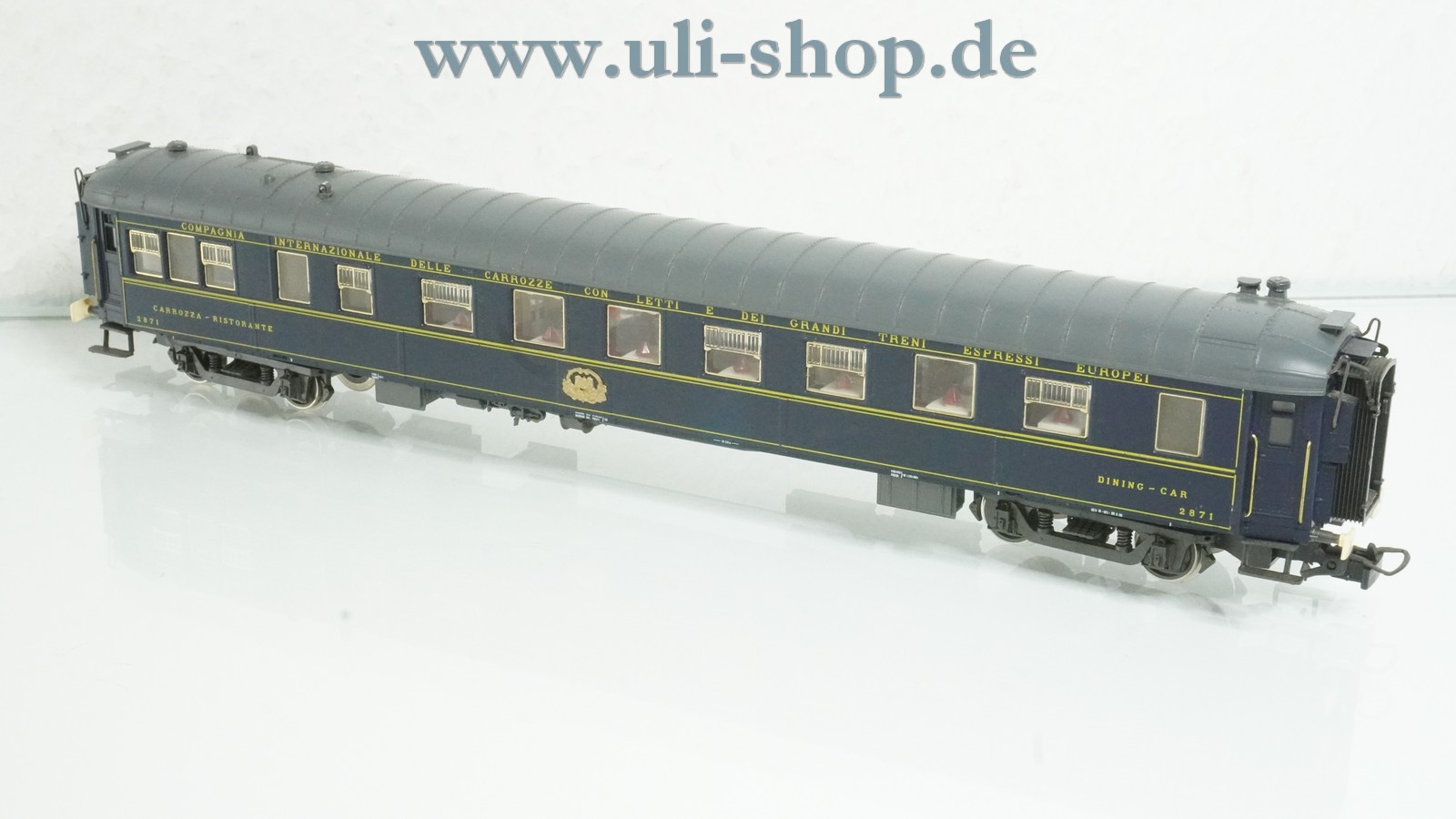 Rivarossi H0 Personenwagen mit der Artikelnummer 2590 Orient Express CIWL-Dining-Car Wagen Nr. 2871. Der Artikel ist für den Betrieb mit Gleichstrom vorgesehen. Die Originalverpackung ist vorhanden.