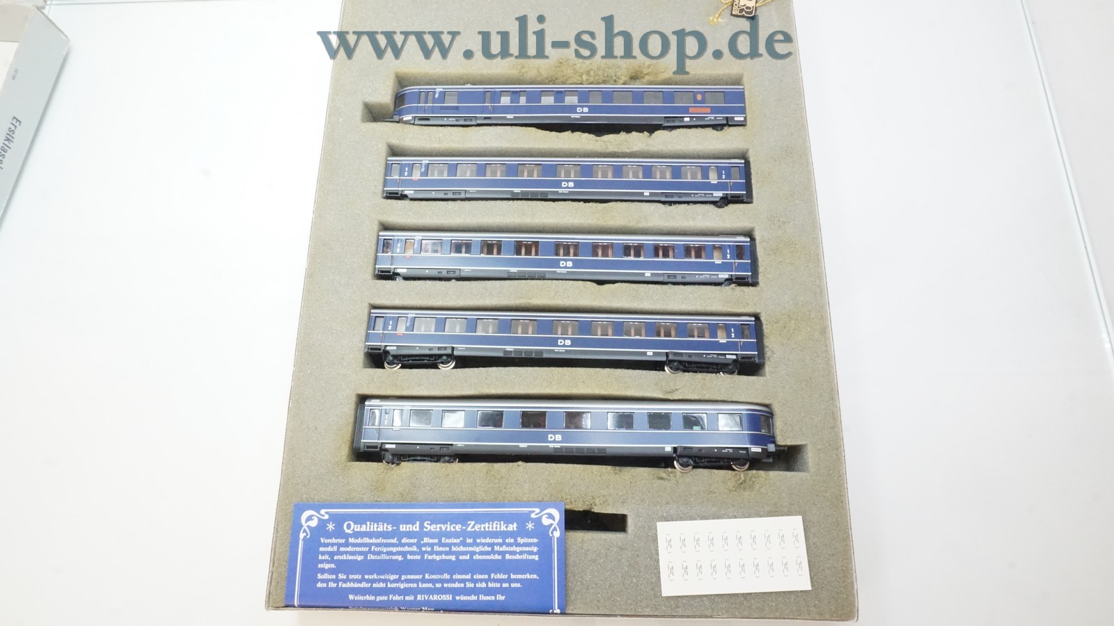 Rivarossi H0 Wagenpackung mit der Artikelnummer 2900 Blauer Enzian. Der Artikel ist für den Betrieb mit Gleichstrom vorgesehen. Die Originalverpackung ist vorhanden.