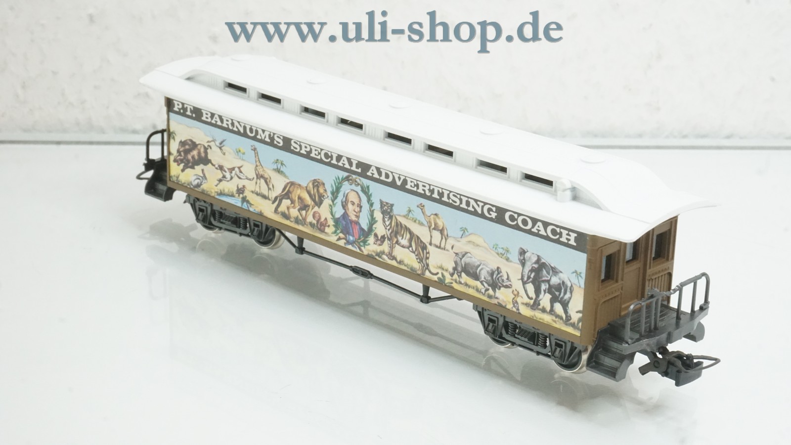 Rivarossi H0 Güterwagen mit der Artikelnummer 2998 Zirkuswagen P. T. Barnum´s Special Advertising Coach. Der Artikel ist für den Betrieb mit Gleichstrom vorgesehen. Die Originalverpackung ist vorhanden.