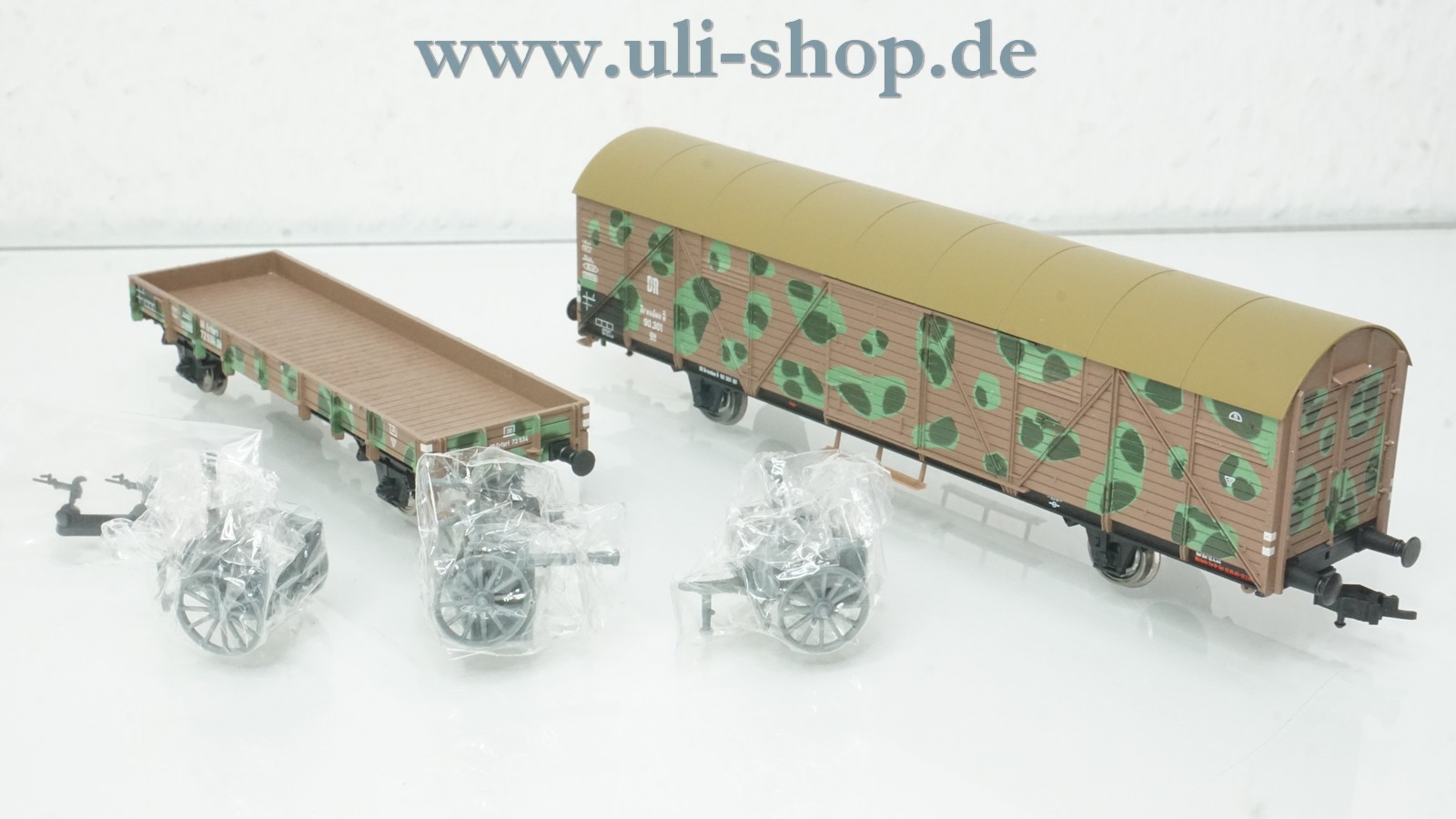 Rivarossi H0 Wagenpackung mit der Artikelnummer HR6041 Camouflage Wagons. Der Artikel ist für den Betrieb mit Gleichstrom vorgesehen. Die Originalverpackung ist vorhanden.