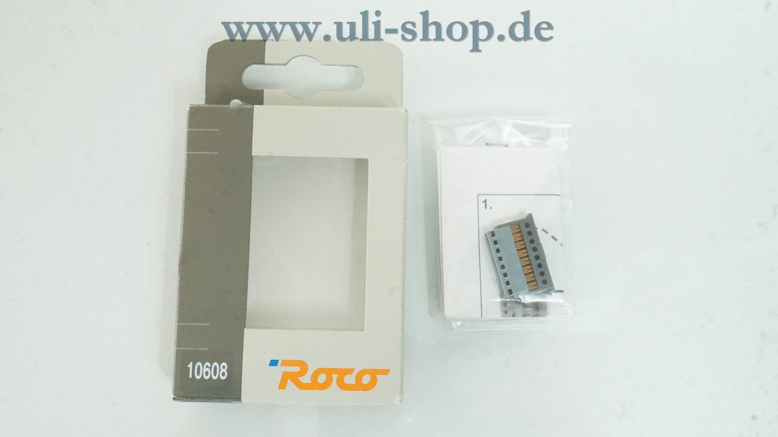 Roco H0 mit der Artikelnummer 10608 8-poliger Verbindungsstecker für Flachbandkabel. Die Originalverpackung ist vorhanden.