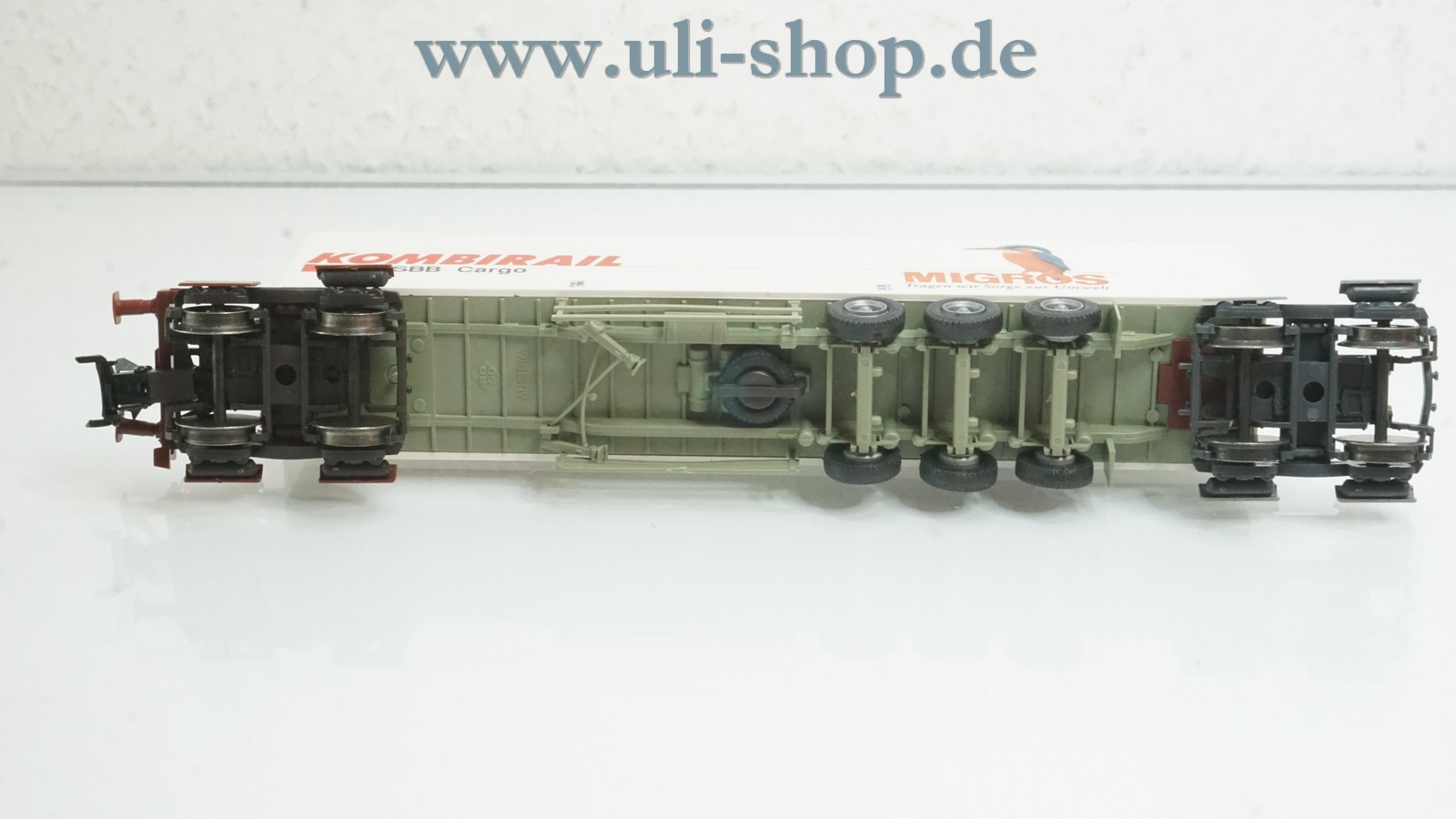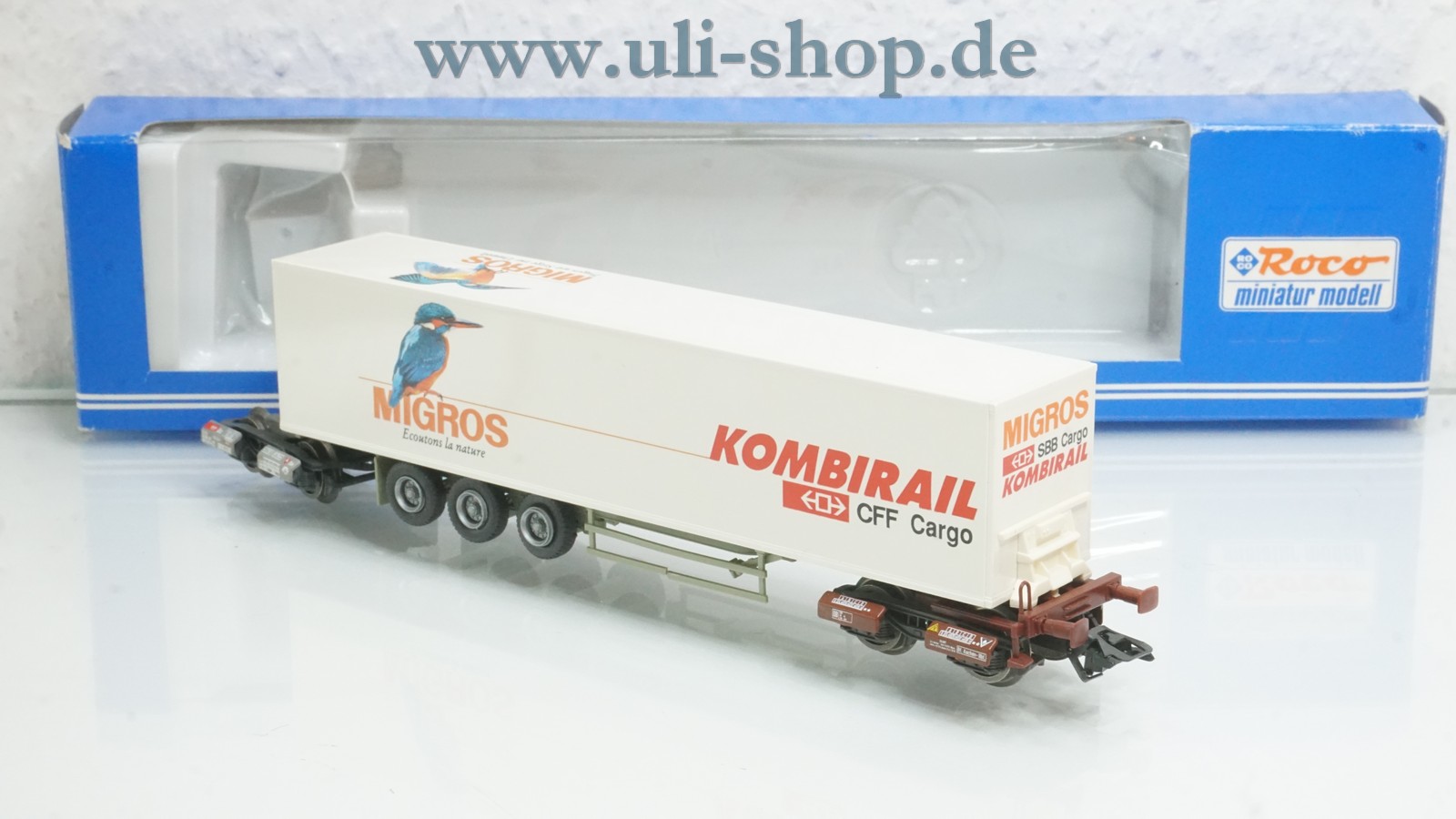 Roco H0 Güterwagen mit der Artikelnummer 1913 Kombi Rail Kühlkoffer MIGROS. Der Artikel ist für den Betrieb mit Wechselstrom vorgesehen. Die Originalverpackung ist vorhanden.