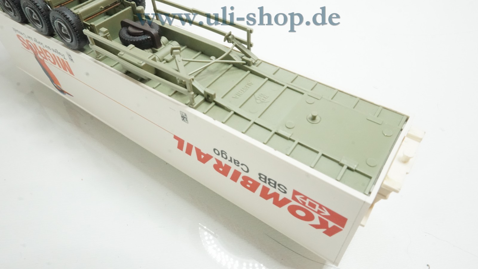 Den optischen Zustand würde ich als wenig bespielt/gebraucht mit leichten Gebrauchsspuren bezeichnen. Die Stützen des Aufliegers sind beschädigt.Der Wagen hat zwei unterschiedliche, nicht originale Drehgestelle (DB und SBB).