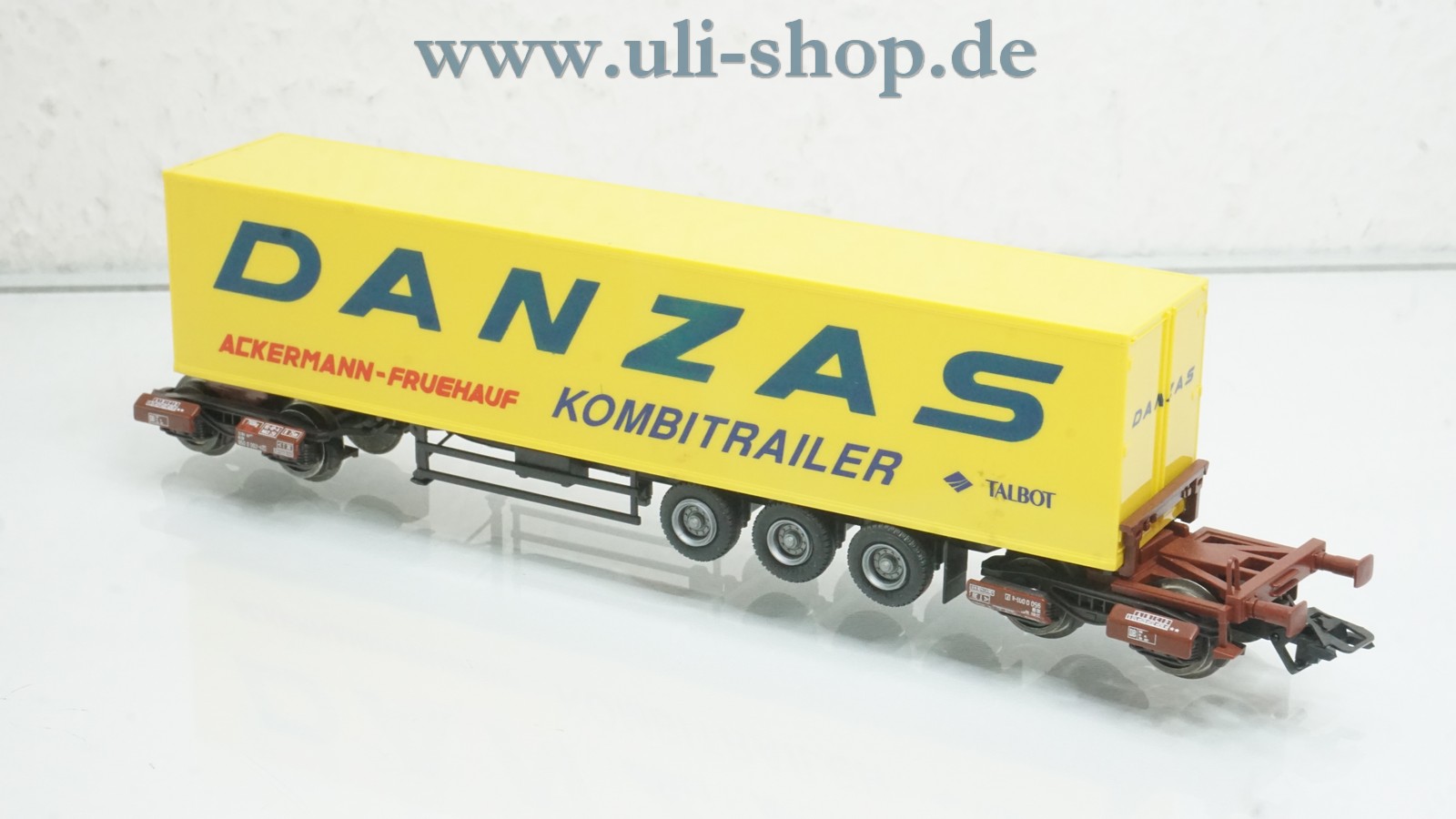Roco H0 Güterwagen mit der Artikelnummer 1914 Kombi Rail DANZAS. Der Artikel ist für den Betrieb mit Wechselstrom vorgesehen. Die Originalverpackung ist vorhanden.