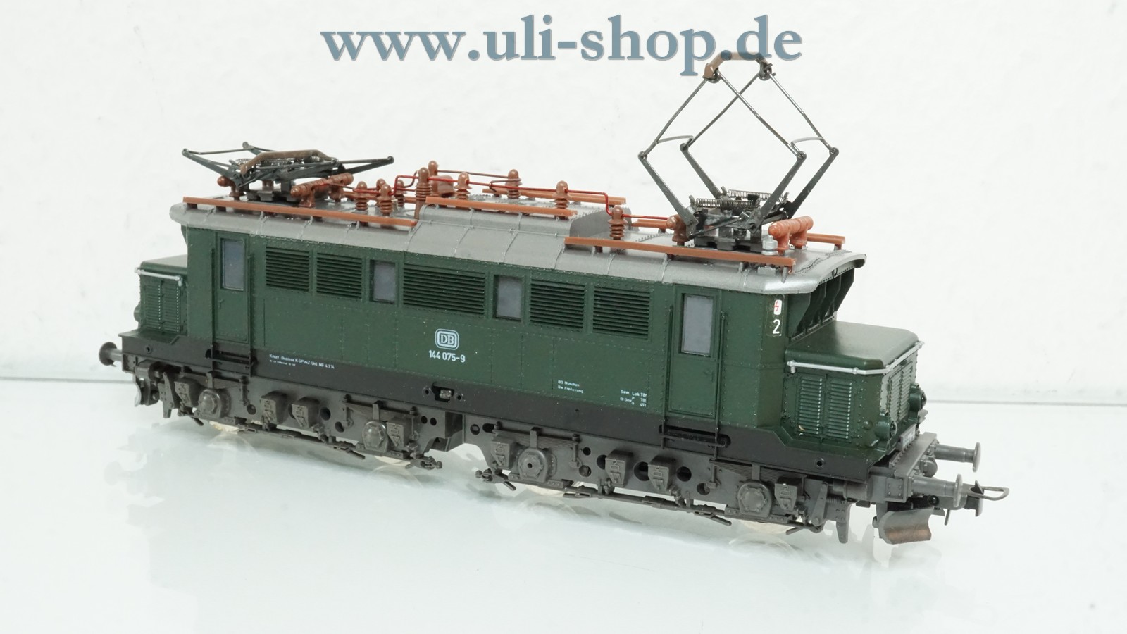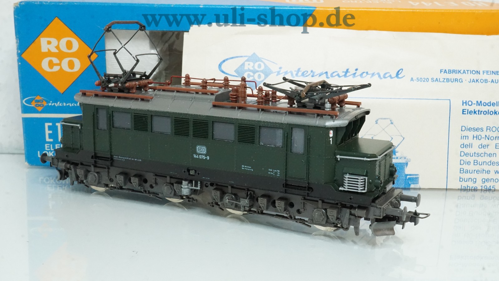 Roco H0 E-Lok mit der Artikelnummer 4131 Br. 144 075-9 der DB. Der Artikel ist für den Betrieb mit Gleichstrom vorgesehen. Die Lok ist analog, sie kann daher nicht auf digital gesteuerten Anlagen fahren. Die Originalverpackung ist vorhanden.