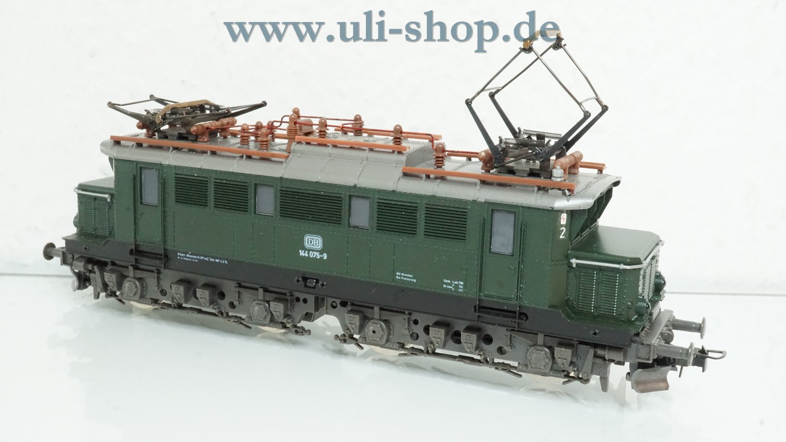 Roco H0 E-Lok mit der Artikelnummer 4131 Br. 144 075-9 der DB. Der Artikel ist für den Betrieb mit Gleichstrom vorgesehen. Die Lok ist analog, sie kann daher nicht auf digital gesteuerten Anlagen fahren. Die Originalverpackung ist vorhanden.