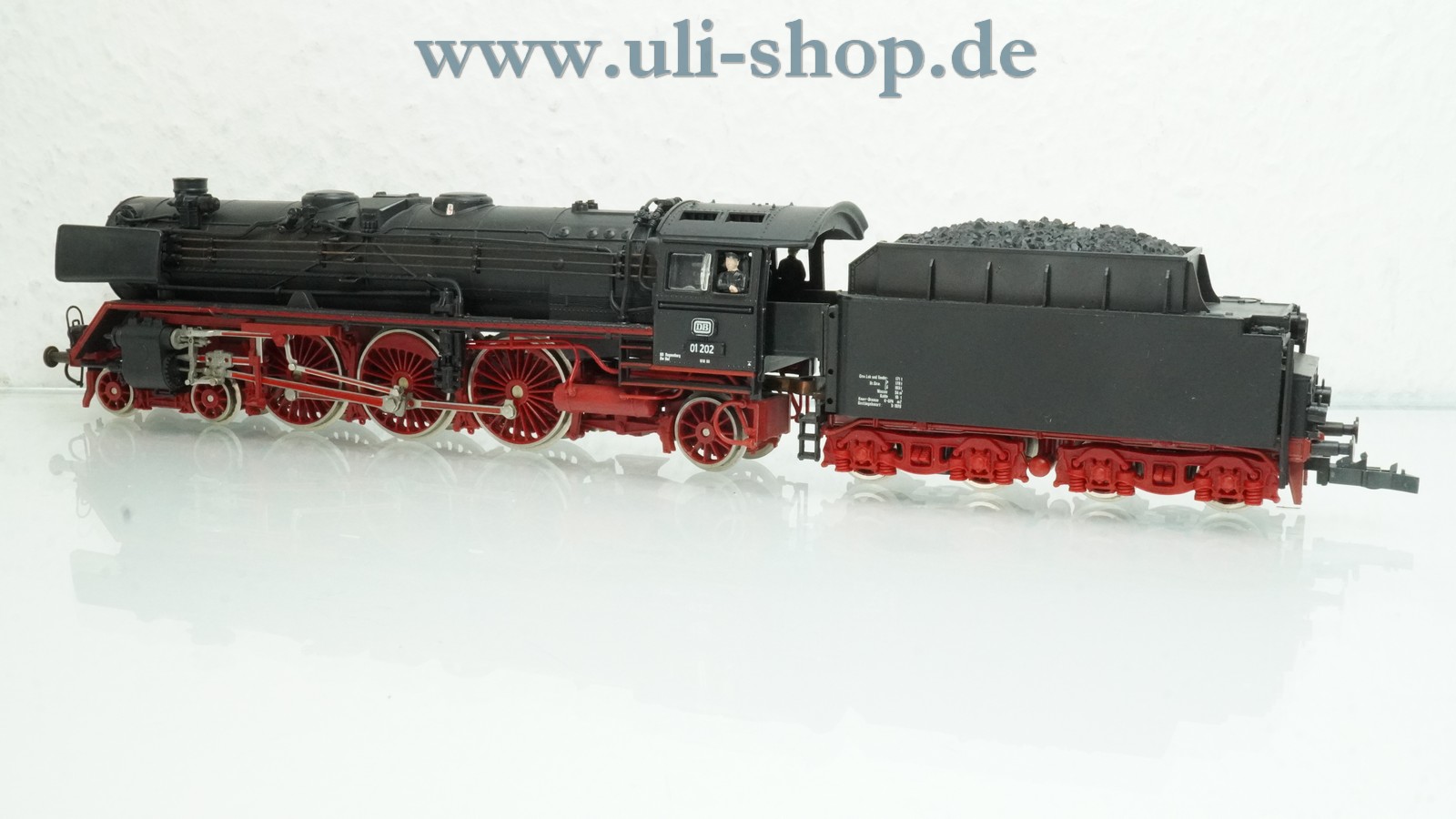 Roco H0 Dampflok mit der Artikelnummer 43242 Br. 01 202 der DB. Der Artikel ist für den Betrieb mit Gleichstrom vorgesehen. Die Lok ist analog, sie kann daher nicht auf digital gesteuerten Anlagen fahren. Die Originalverpackung ist leider nicht mehr vorhanden. Durch die festgeklebten Kolbenschutzrohre kann die Lok keinen Kurvenradius R1 befahren.